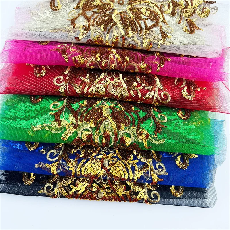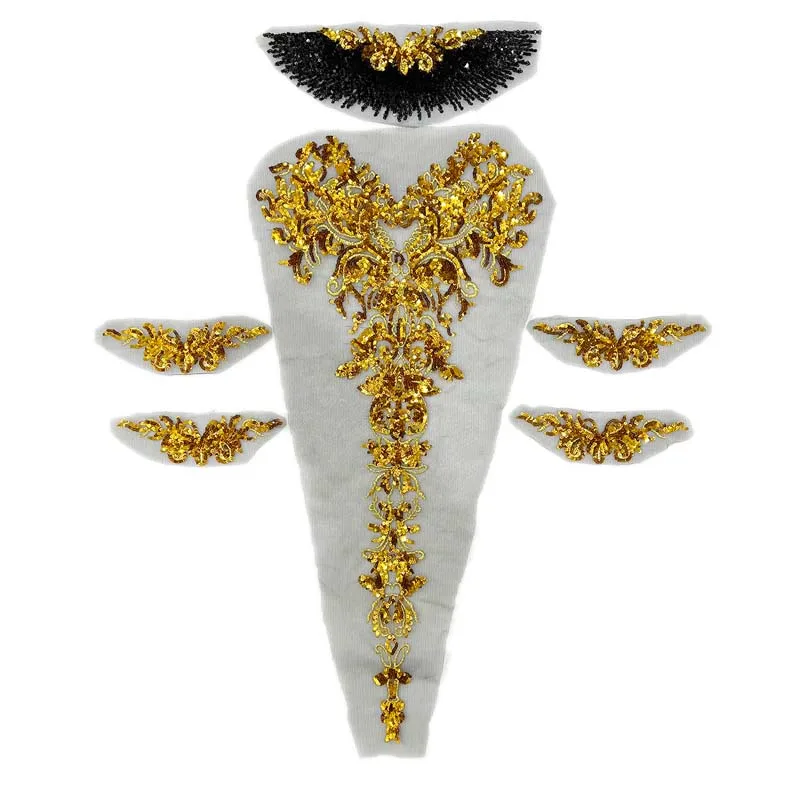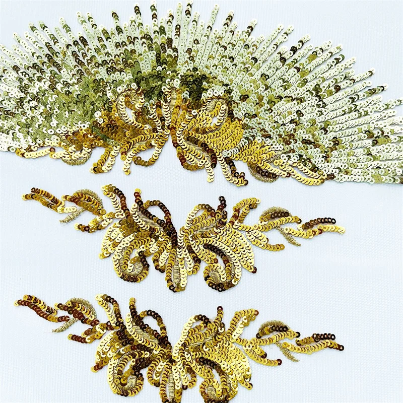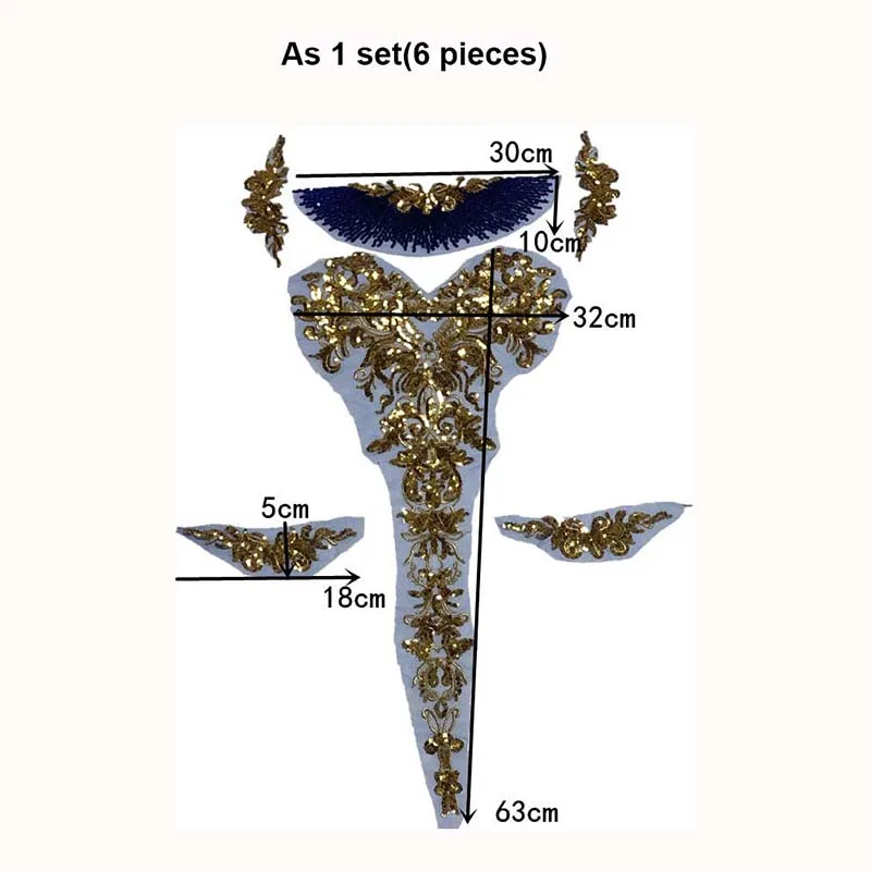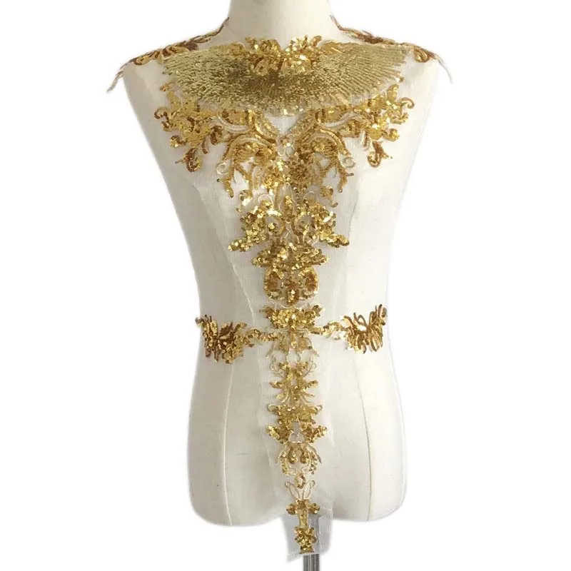 Apliques de flores de lentejuelas doradas de 29x64CM, parches bordados de encaje de tela para coser, costura artesanal para vestido de boda, vestido de fiesta, parche para corpiño