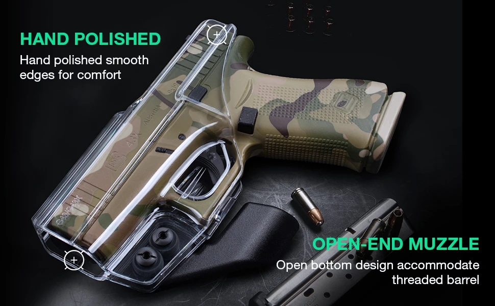 PROTECCIÓN DE GATILLO DE CUBIERTA COMPLETA Y CORTE DE BOZAL ABIERTO: La funda Glock 43X IWB está diseñada para cubrir el botón de la revista-Bozal de extremo abierto cortado en exceso con barril roscado
