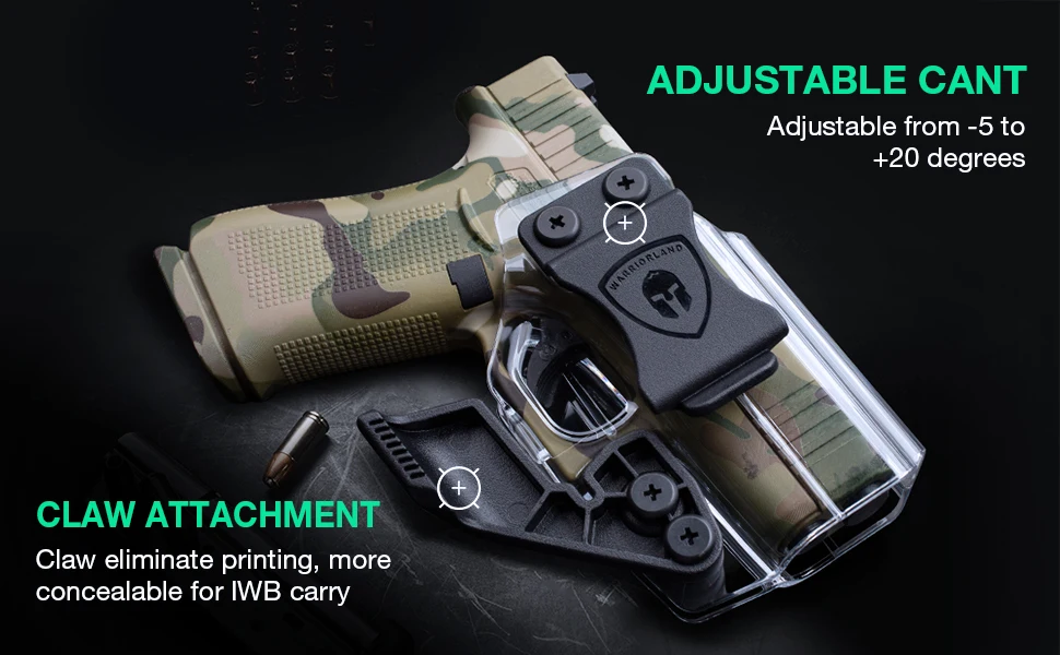 CANT Y RETENCIÓN AJUSTABLE: los caninos son ajustables de-5 a + 20 grados-La retención es ajustable para un dibujo rápido adecuado y la estanqueidad de la funda-Súper adecuado para el transporte diario oculto