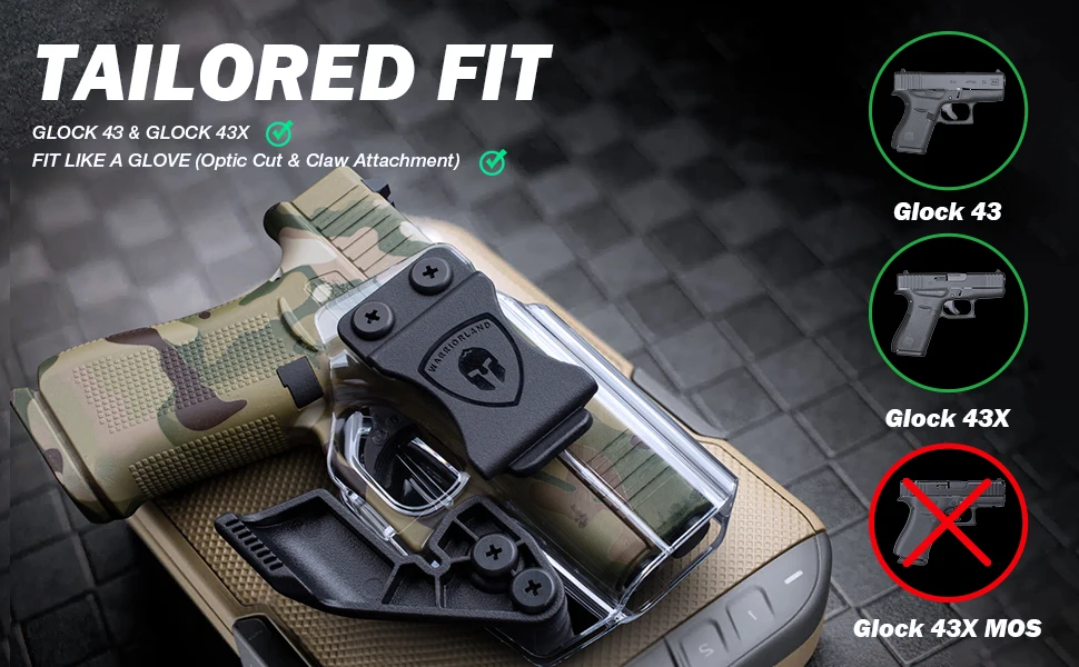 COMPATIBILIDAD: La funda es compatible con Glock 43 / 43X-No es compatible con Glock 43X MOS con riel, ni ningún láser/luz.