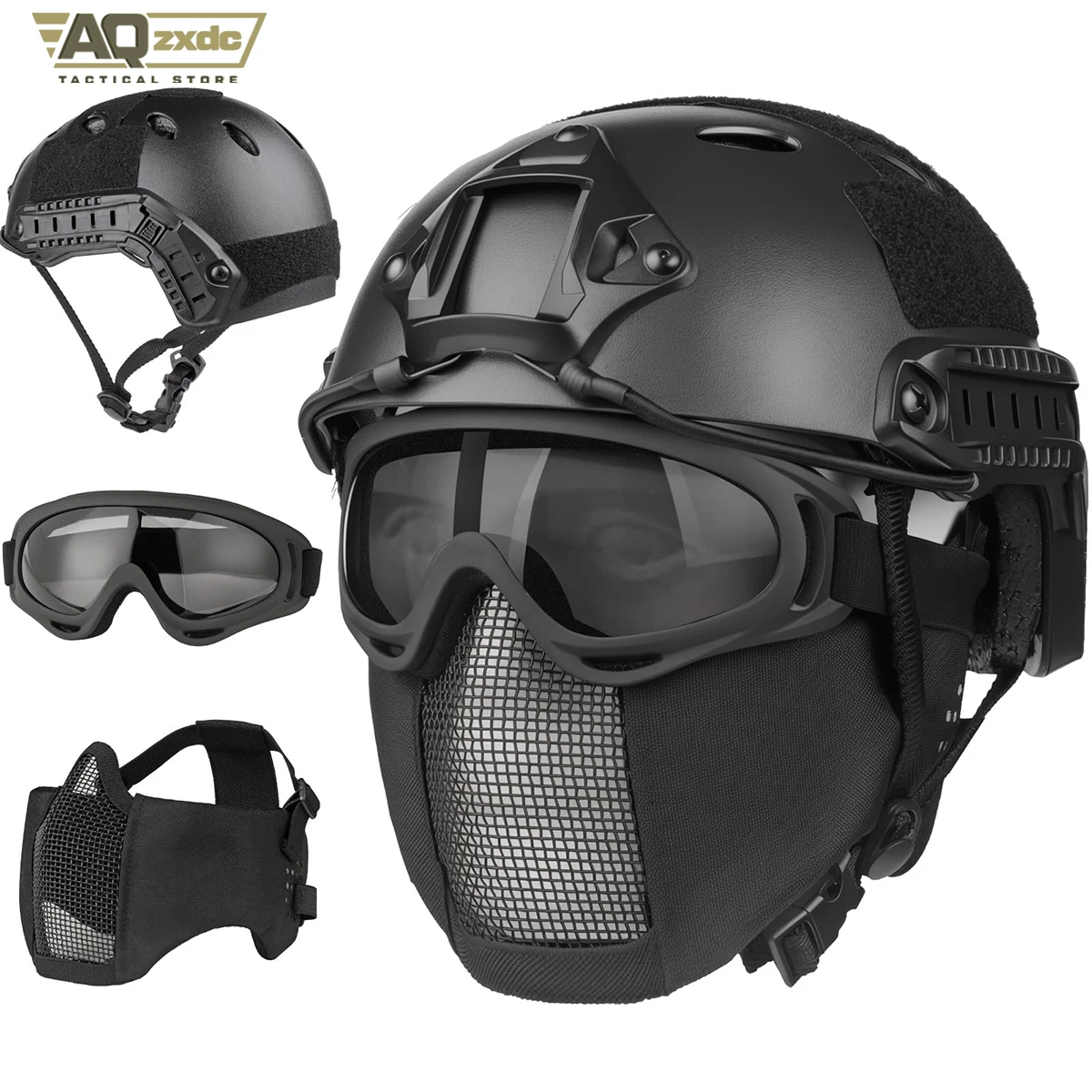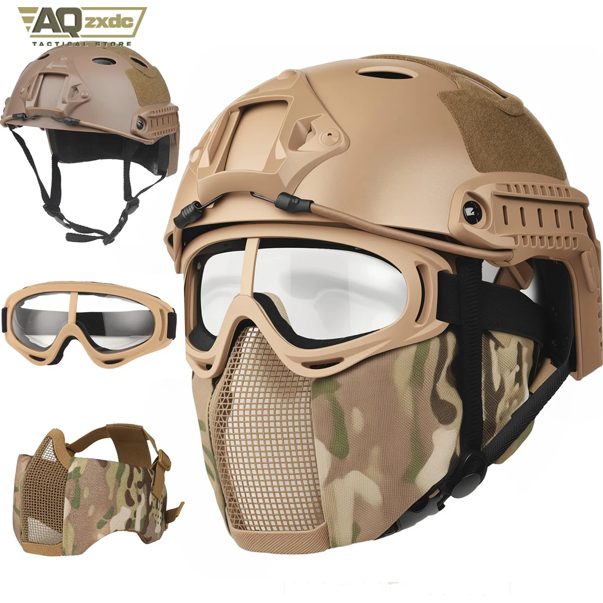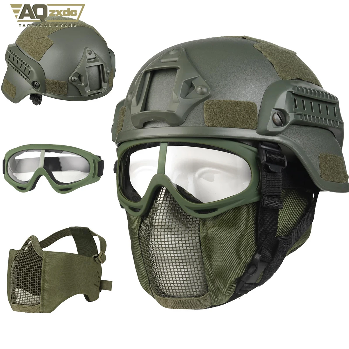 AQzxdc Conjunto de casco táctico, máscara de airsoft, máscara de pasamontañas elástica de malla, gafas antivaho para airsoft, protección táctica de cara completa