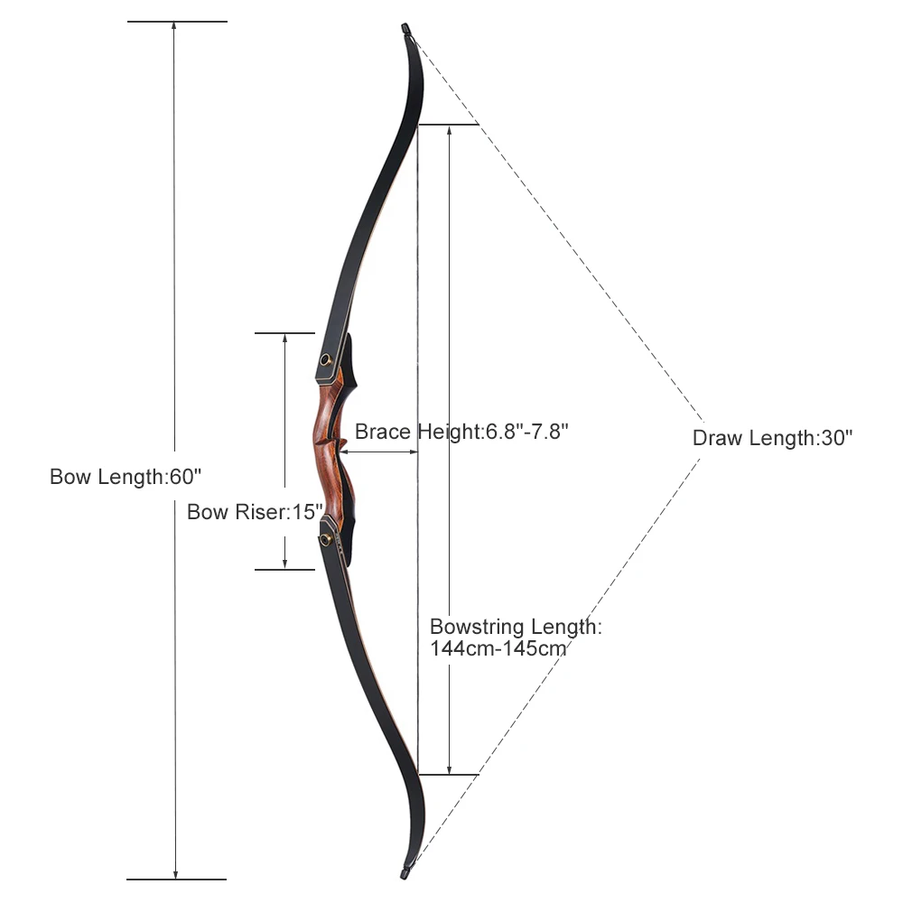 Este es un arco recurvo de desmontaje laminado de 60 ". Las extremidades están laminadas con láminas de bambú, madera y fibra de vidrio. El bambú es bueno por su fuerza y elasticidad. La rama es un núcleo de madera rodeado de fibra de vidrio y bambú. Las puntas de las extremidades están reforzadas para aceptar cuerdas de arco para dibujarPeso de hasta 50 lbs. Este es un modelo recurvo, no un modelo de arco largo. Tenemos extremidades separadas disponibles para mejorar/degradar su peso de extracción rápidamente.