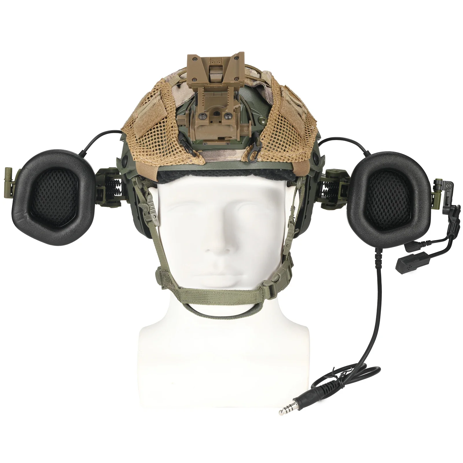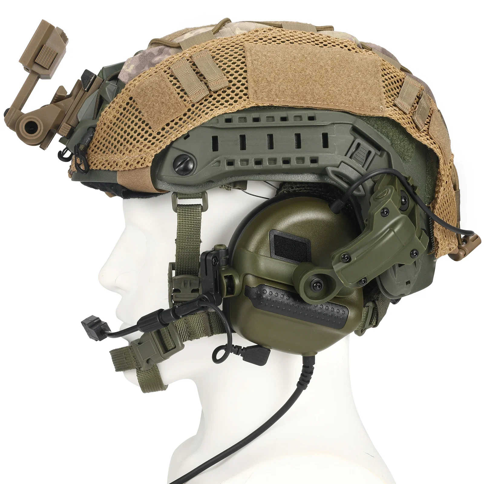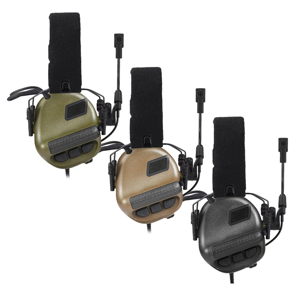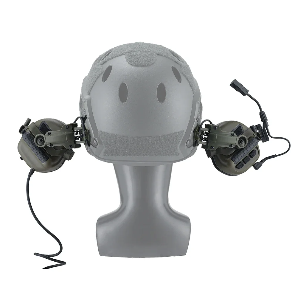 Especificaciones:-Material: Nylon + 35 fibra-Reducción de ruido: NRR22DB;-Peso: aproximadamente 0,55 kg-Escenarios aplicables: militar, caza, deportes al aire libre y otras competiciones tácticas de airsoft, etc.Características PTT: