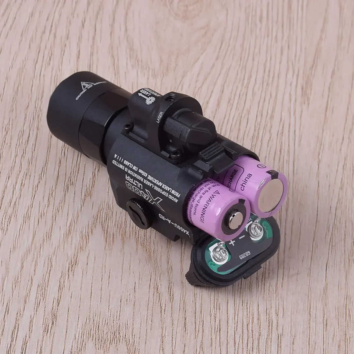 El X400 Ultra funciona con dos baterías CR123A, lo que proporciona una autonomía de aproximadamente 1,25 horas para la combinación de luz y láser.Cuenta con conmutación ambidiestra, lo que permite una fácil activación y selección de modo incluso durante situaciones de alto estrés.