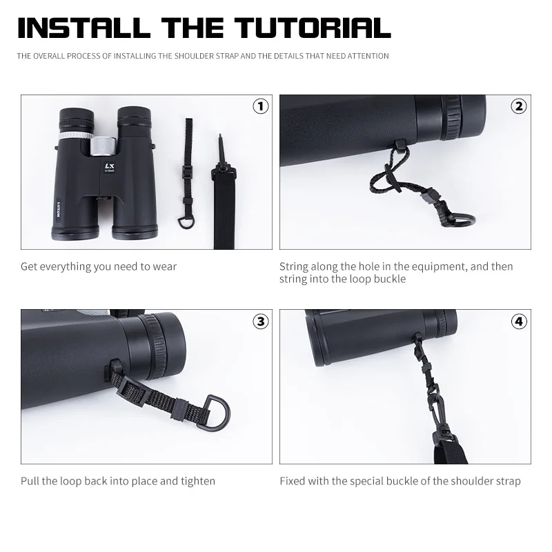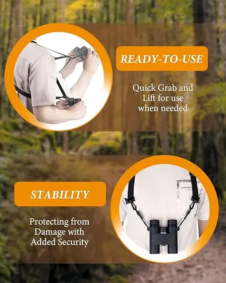 【FLEXIBLE ADJUSTMENT】 - The binocular straps harness flexibly adjusts the length of the straps to fit a variety of body sizes and reduces binocular swaying on the chest during outdoor activities. The binocular harness strap easily slides the binoculars into the viewing position when you need them