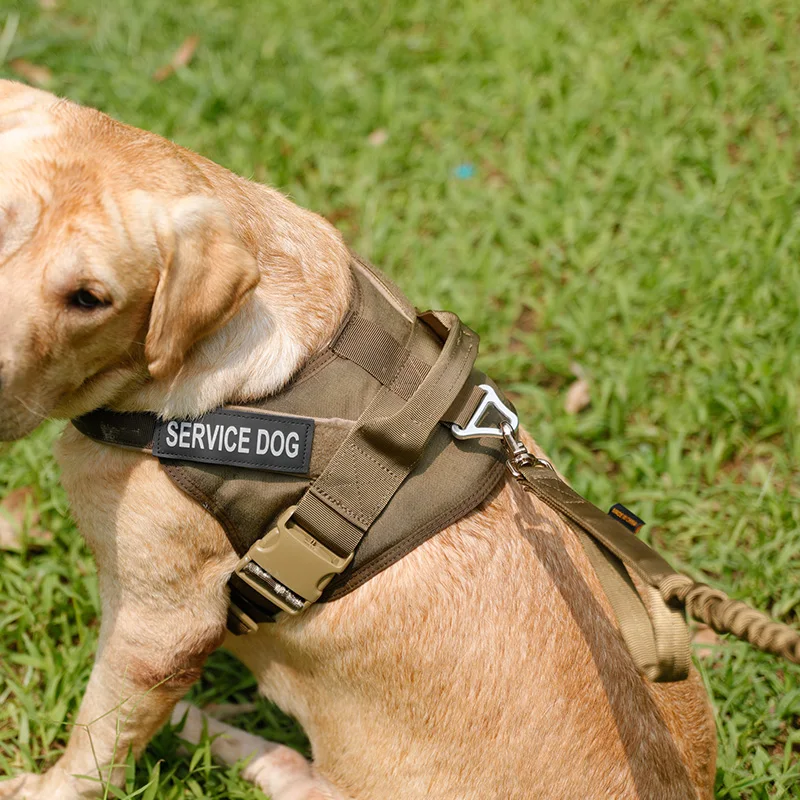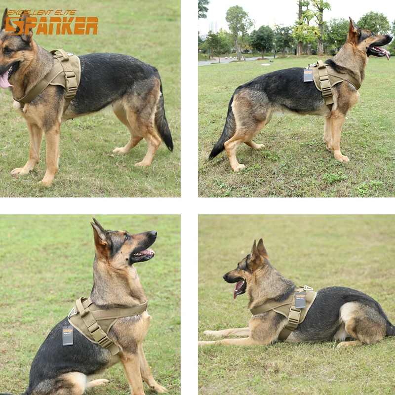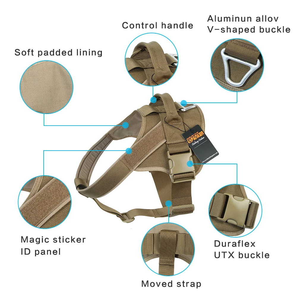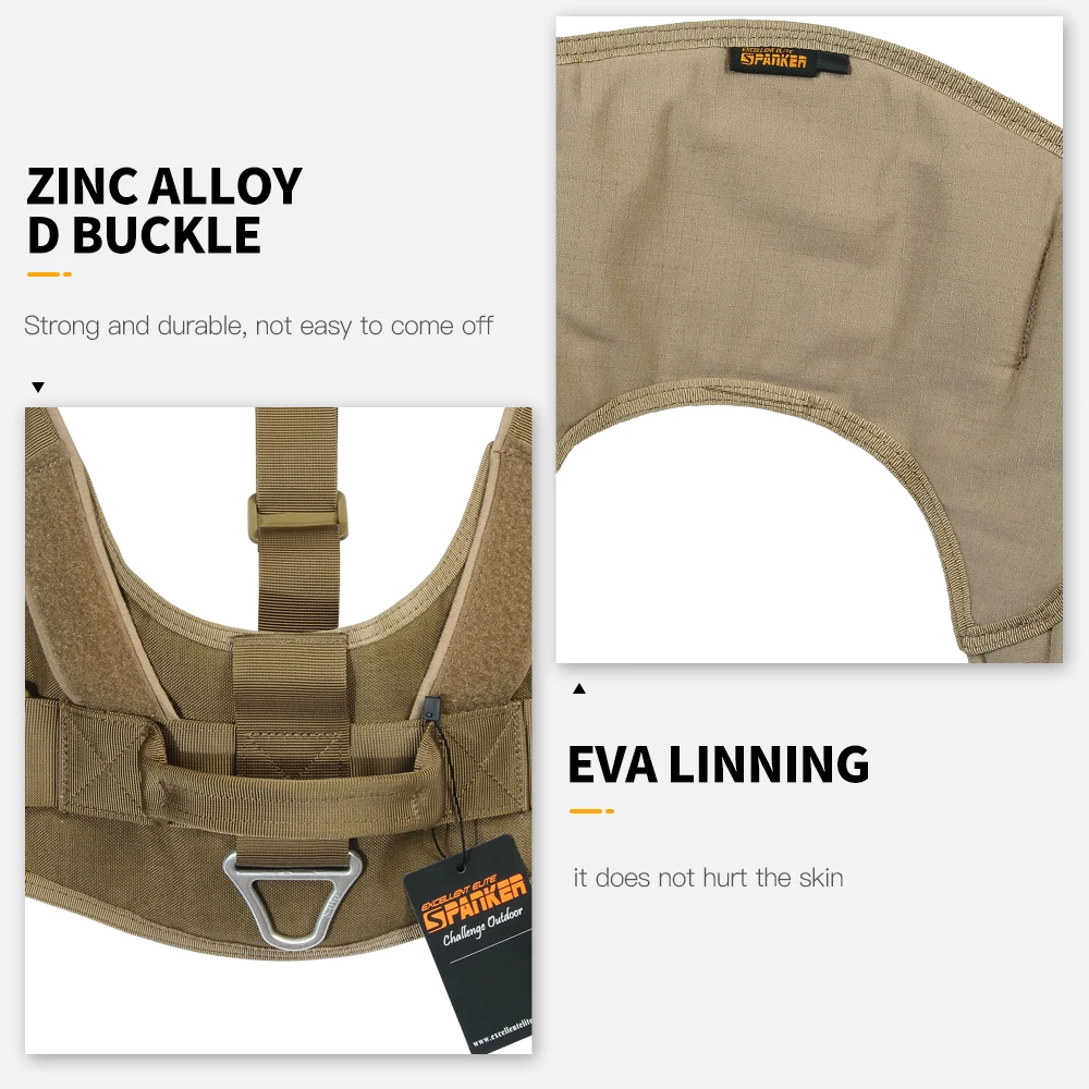 La parte superior del arnés táctico tiene una hebilla en forma de V de aleación de aluminio, un tirón más fuerte que la aleación de ferro y la aleación de zinc, se puede colocar una correa para perros para mantener a su perro junto a usted más fácilmente mediante su control.