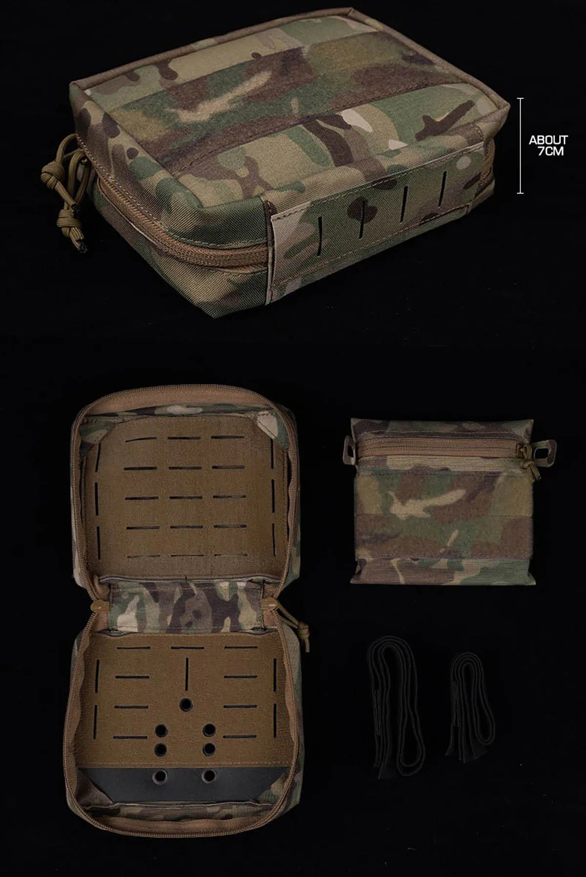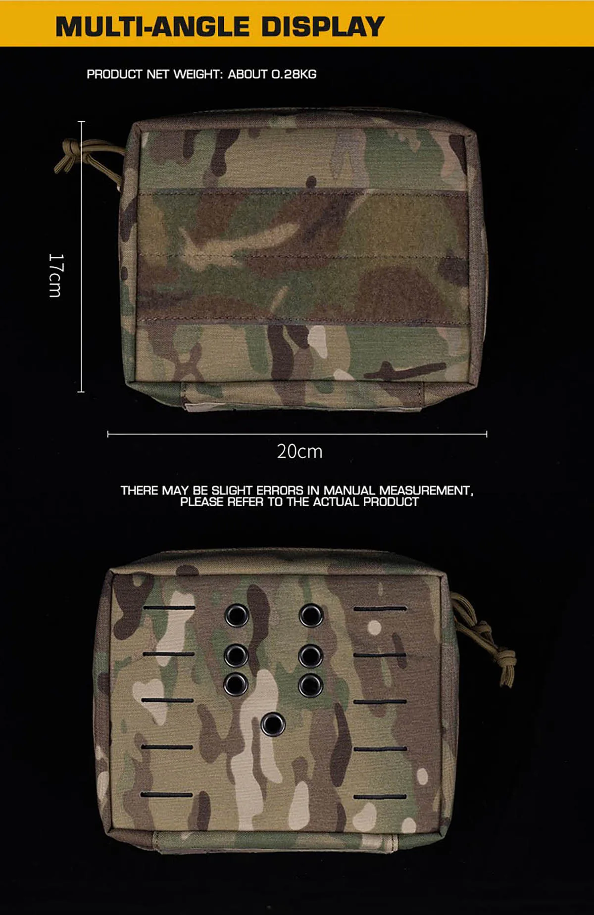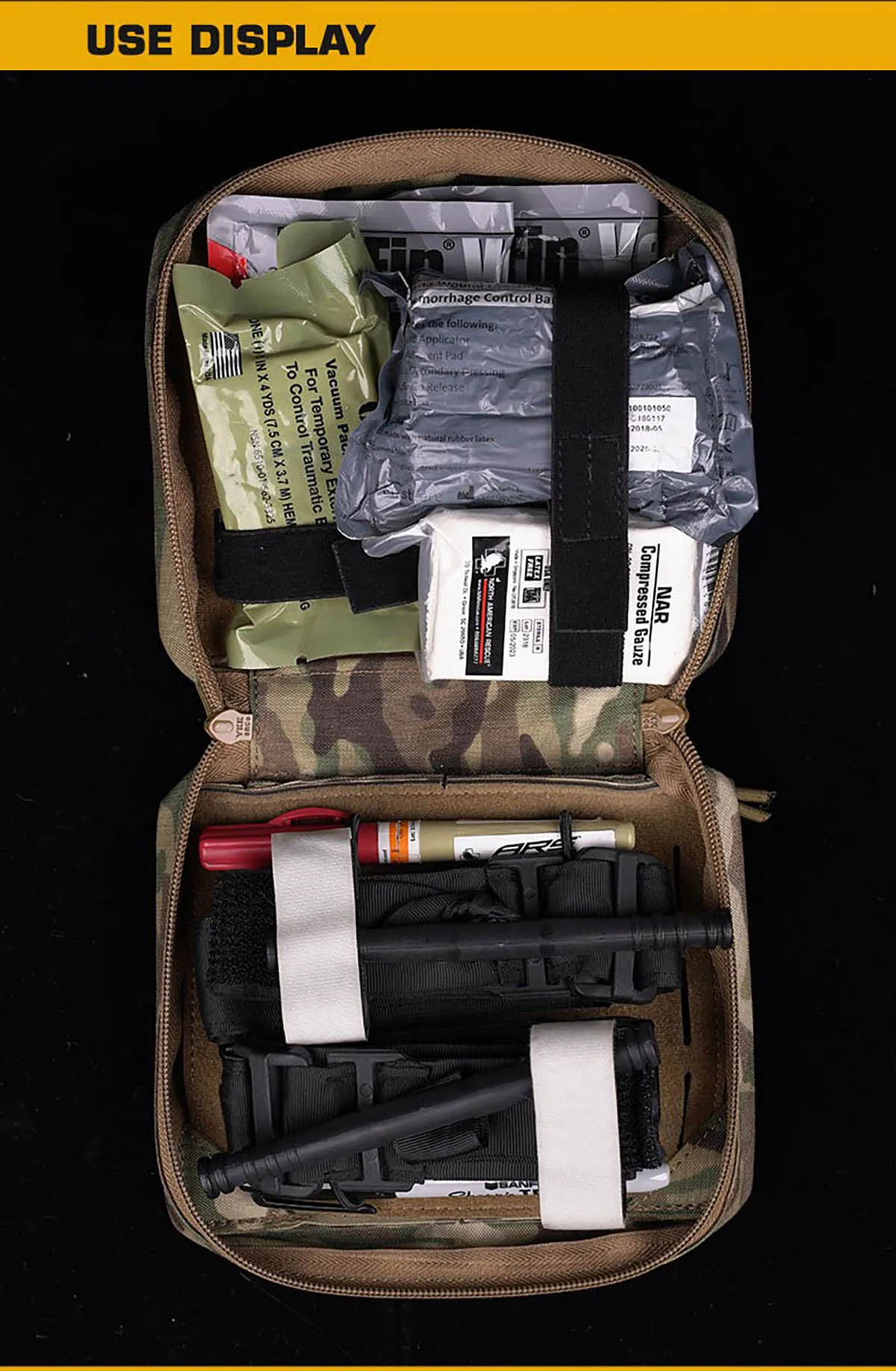 Diseño espacioso y duradero: el compartimento principal ofrece un amplio espacio, como se muestra en la "PANTALLA DE USO", capaz de contener artículos sustanciales como gasa comprimida NAR y otros componentes IFAK estándar.Confeccionado con tela multicam resistente con una cremallera confiable, está diseñado para brindar durabilidad en entornos exigentes.