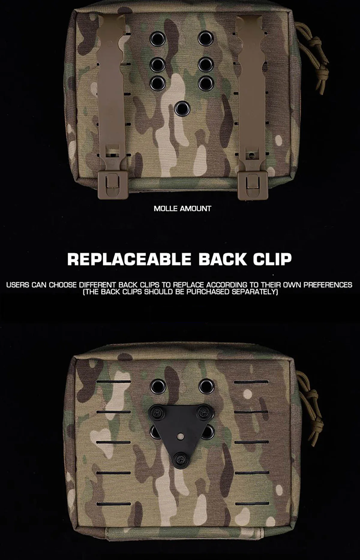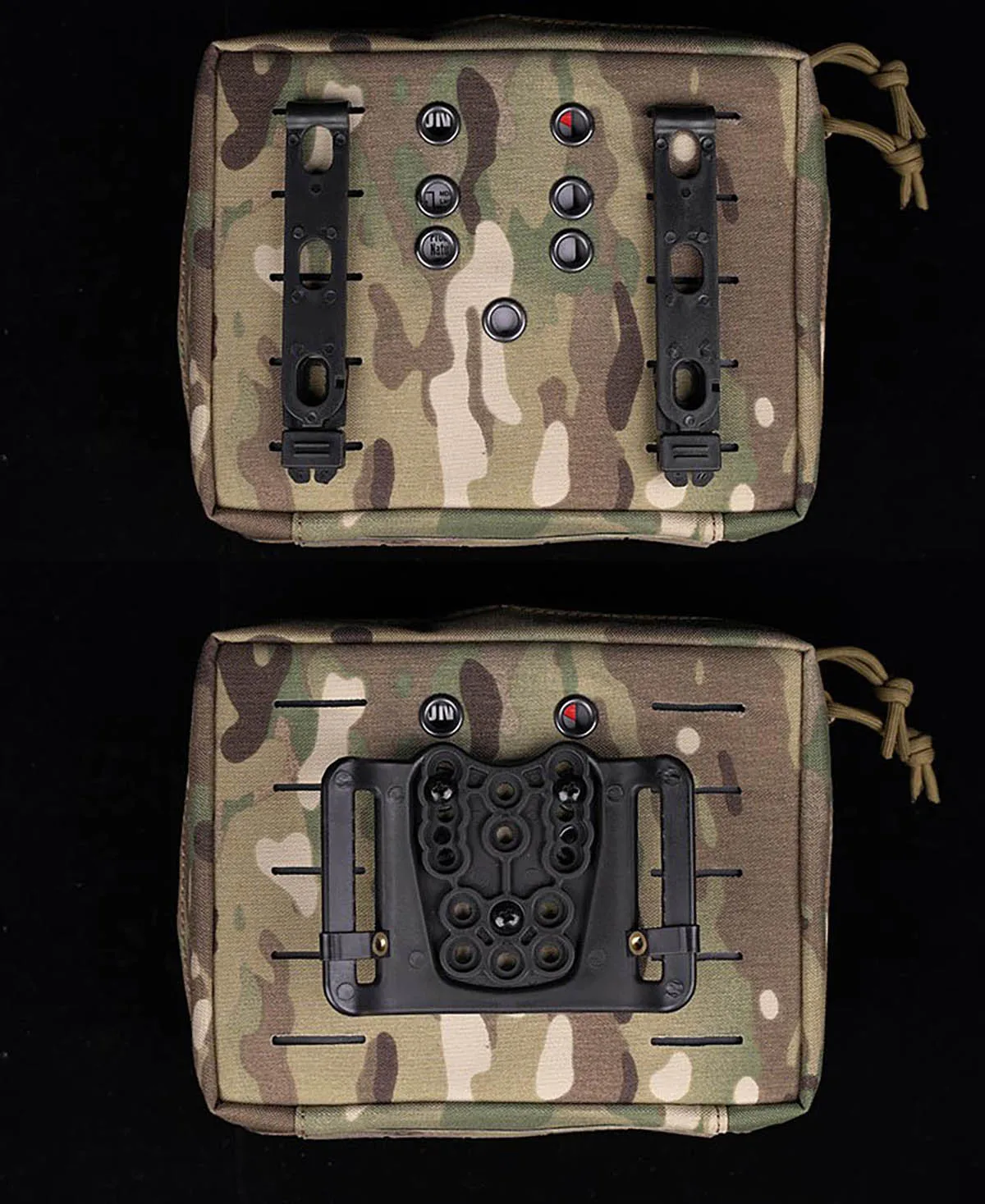 Accesorio versátil y reemplazable: cuenta con un sistema de clip trasero reemplazable compatible con MOLLE.Los usuarios pueden elegir e instalar diferentes estilos de clips traseros (se venden por separado) según sus preferencias, lo que permite un montaje flexible en soportes de placas, cinturones de batalla, mochilas o paneles de vehículos.