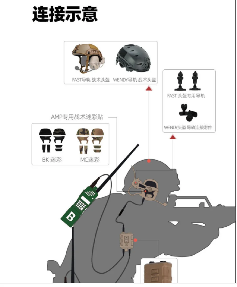 Ámbito de uso: solo es adecuado para auriculares tácticas de reducción de ruido con amplificador FMA conectados al casco.Este puente está dedicado al AMP.Se puede conectar directamente con el casco de fast rail.Se puede reemplazar e instalar en el casco Wendy a través de la opción de conexión del casco Wendy.