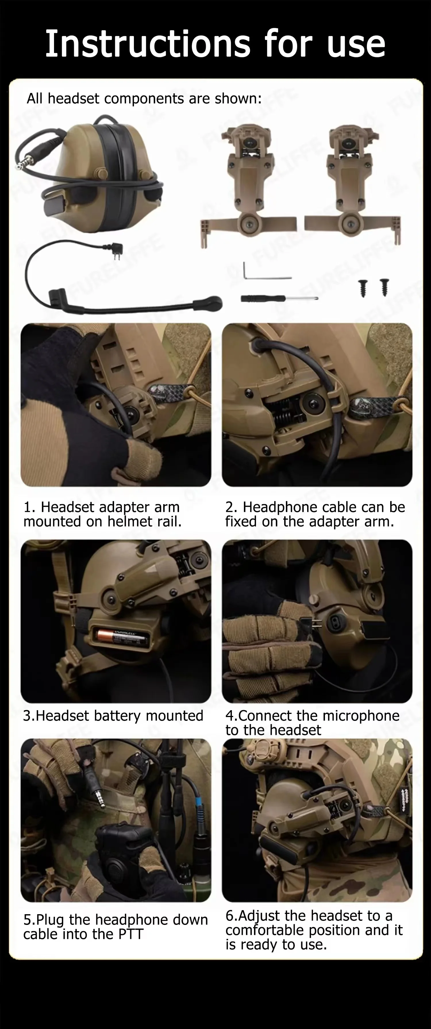 -Se monta en los rieles de un casco táctico con el kit adaptador de riel para casco (se vende por separado).