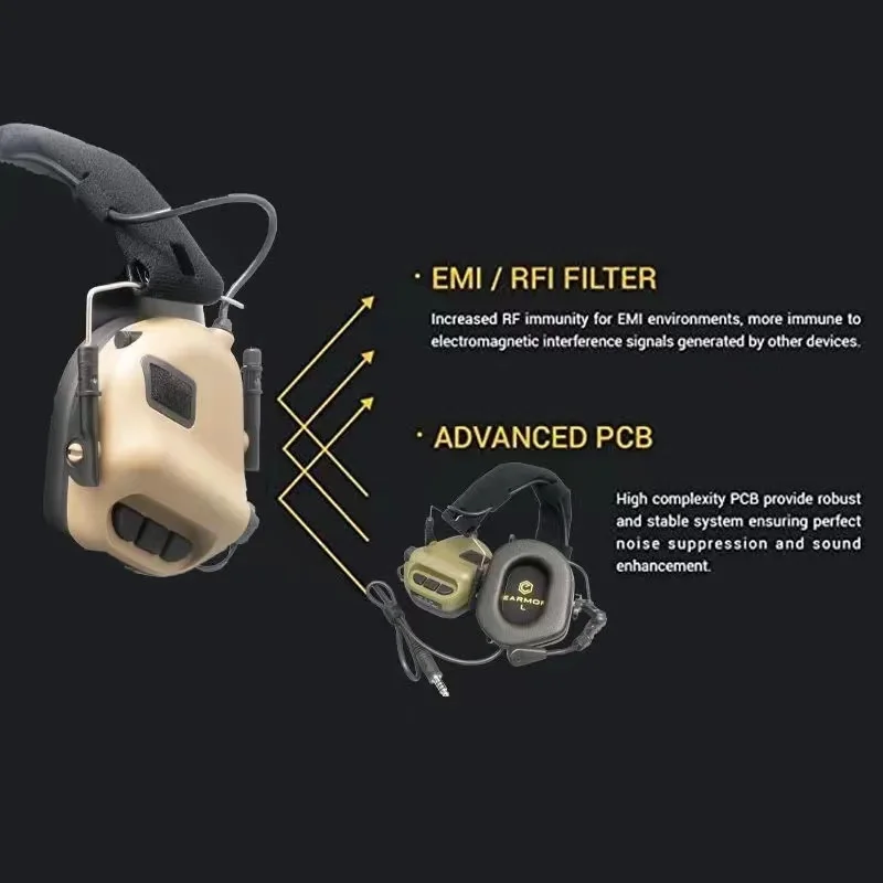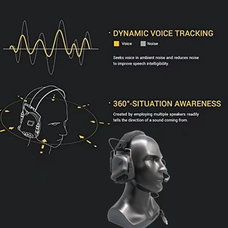 El M32 proporciona protección audible en áreas ruidosas con ruido impulsivo, como zonas de uso de armas de fuego. Los micrófonos montados en las orejeras mejoran el conocimiento de la situación del usuario, al tiempo que le permiten escuchar sonidos de los alrededores y proteger su audición. Los sonidos dañinos se limitan a un nivel seguro de 82 dB, y los más bajos se amplifican.