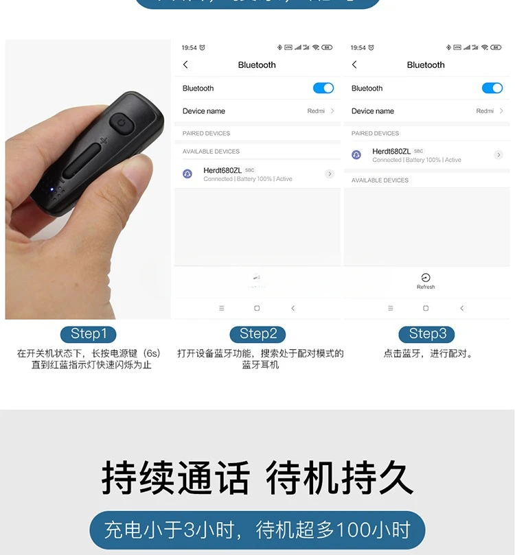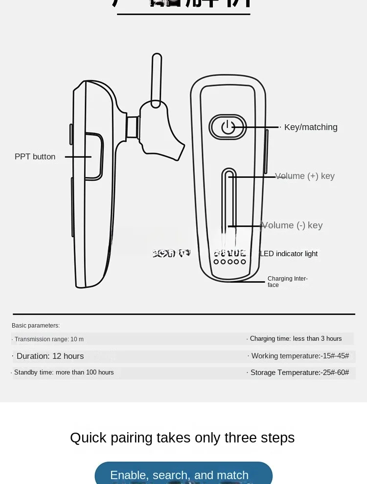 6. Rango de transmisión: 10 metros, tiempo de llamada sostenible de 12 horas, tiempo de espera de 100 horas