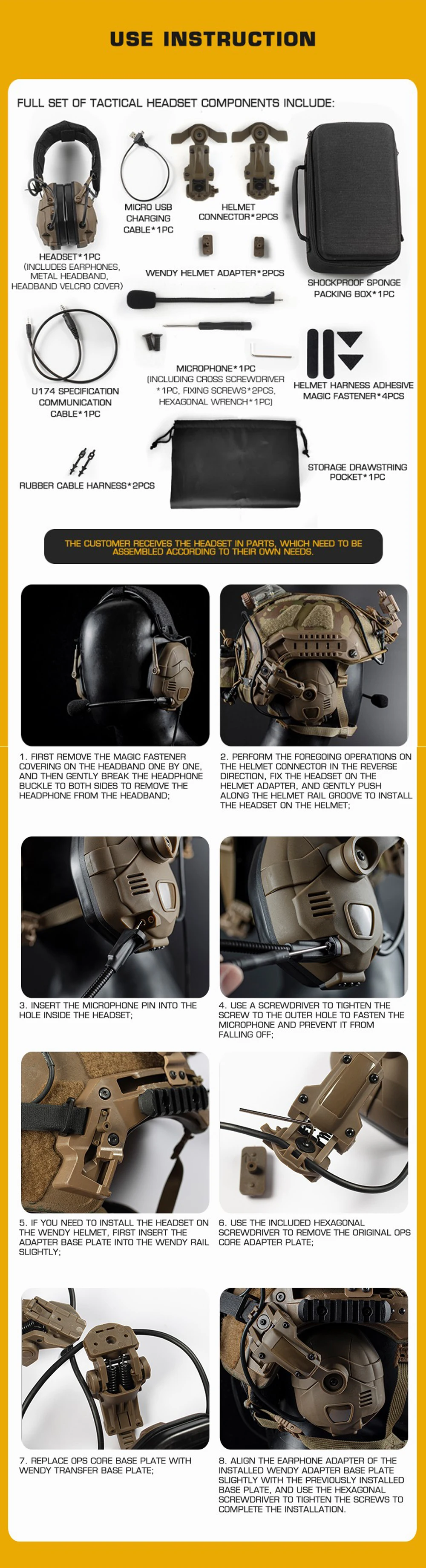 Accesorios del producto: Auriculares * 1 pieza, micrófono * 1 pieza, cable de comunicación * 1 pieza, conector de casco * 2 piezas, pieza de conversión de riel * 2 piezas, caja de paquete, bolsillo de almacenamiento, herramientas