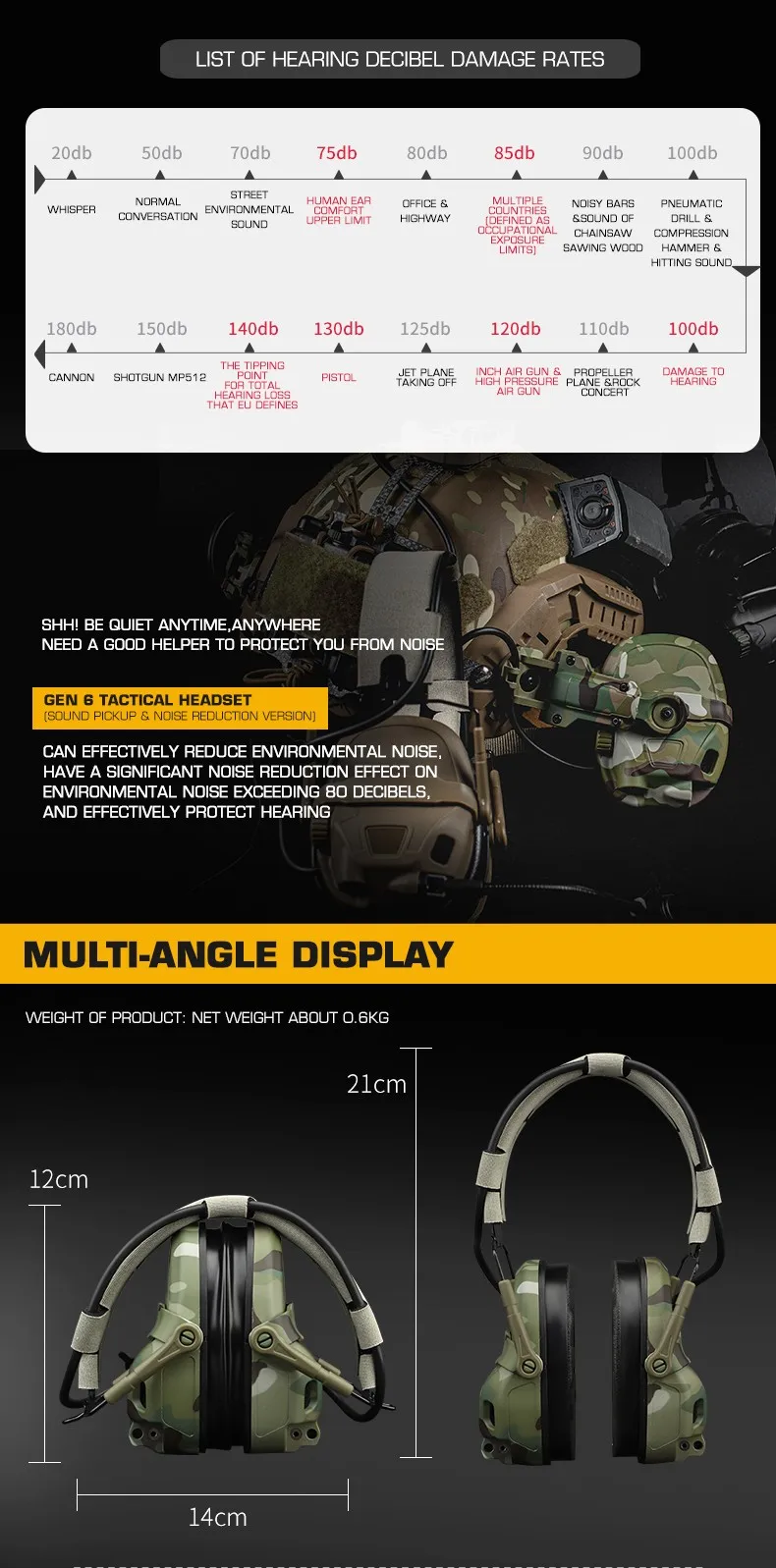 Auriculares tácticos de caza GEN 6 (recogida de sonido y reducción de ruido), orejeras para tiro al aire libre, auriculares militares antiruido Airsoft