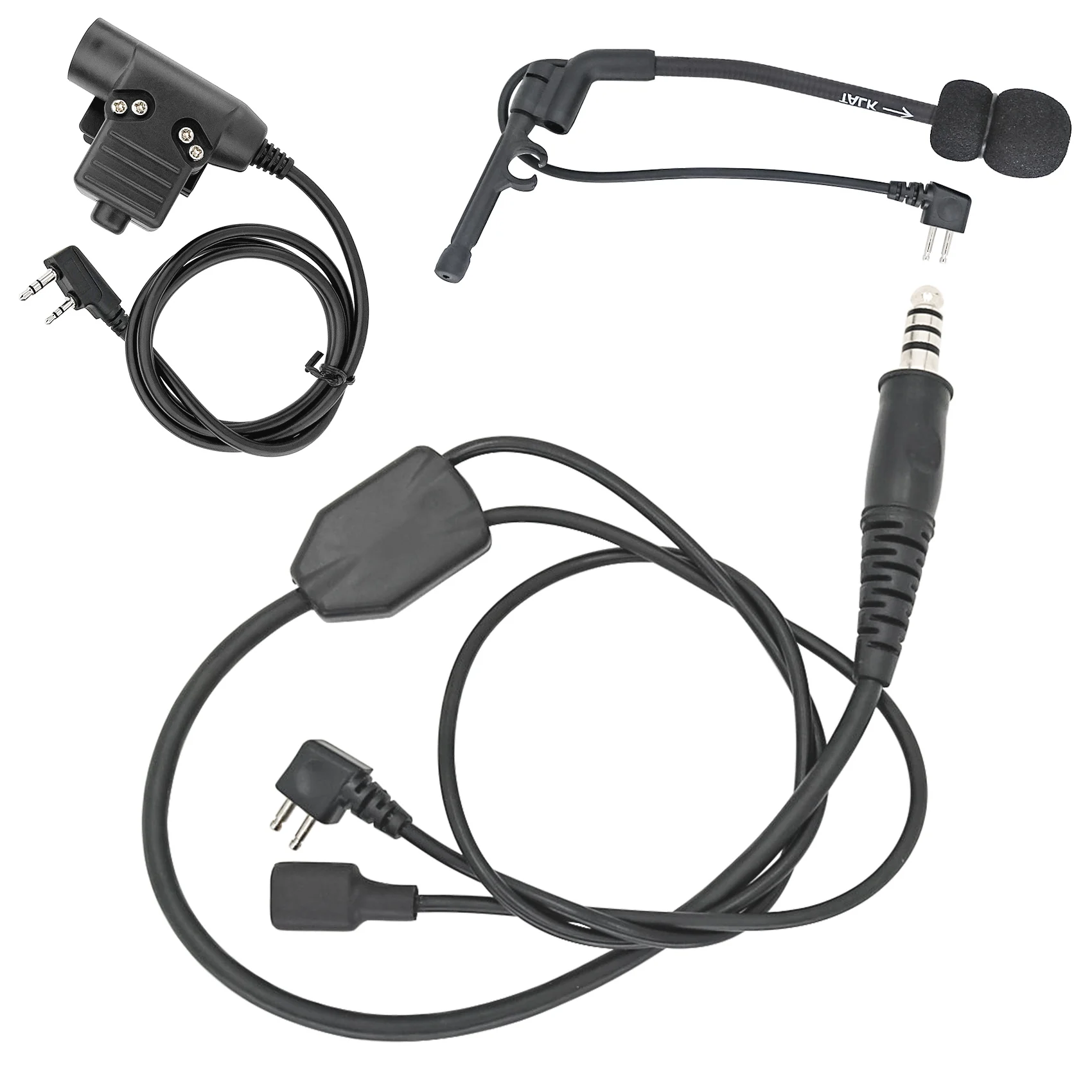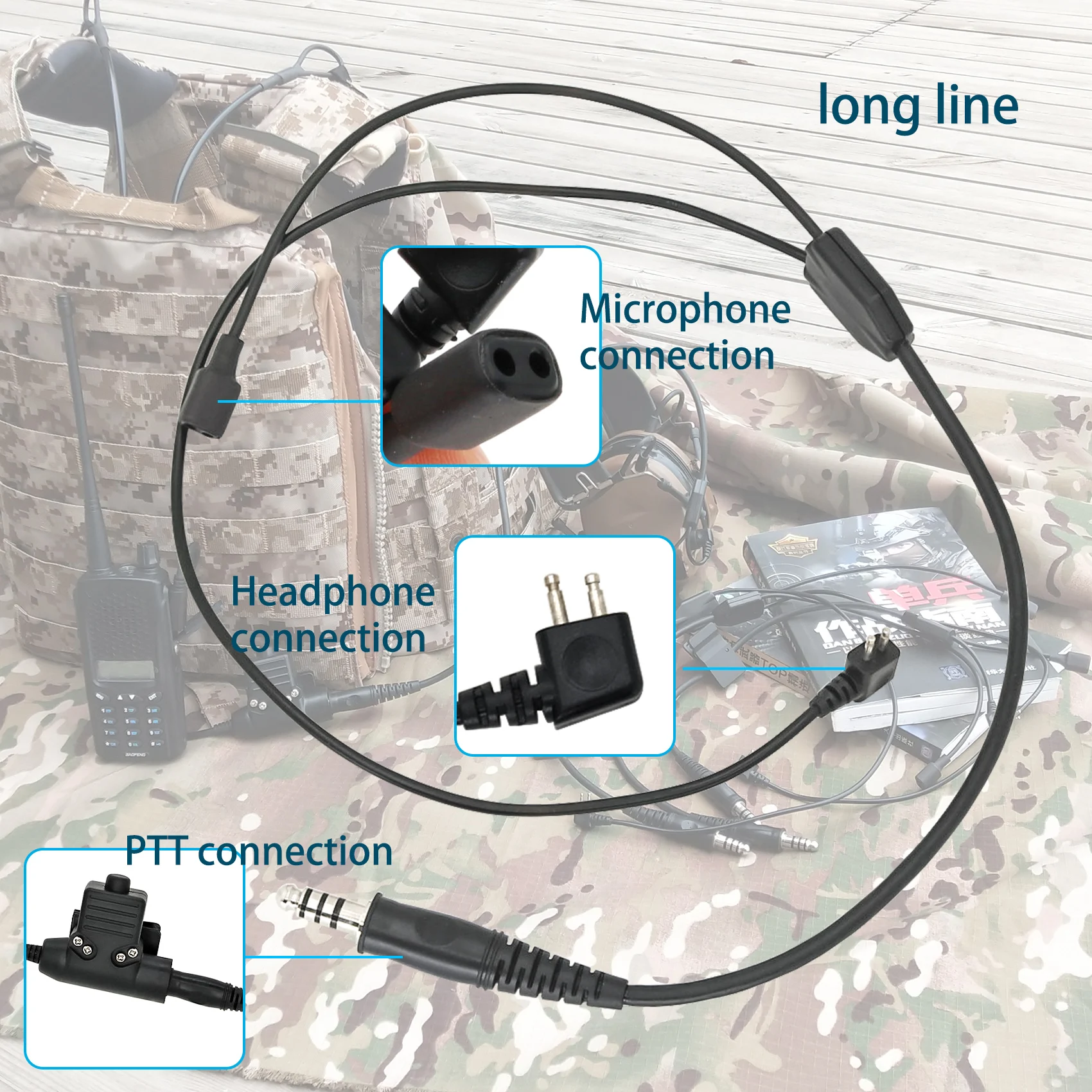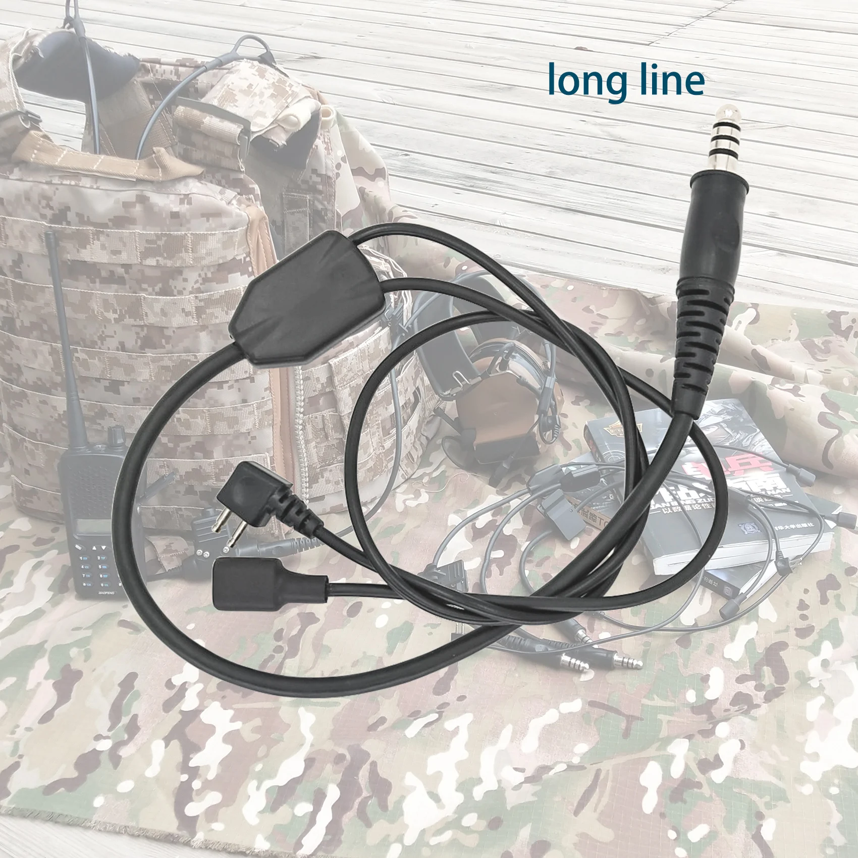 El cable tiene 2 enchufes y un conector.El primer enchufe es un enchufe estándar militar de 7,00 mm, que se puede insertar directamente en el PTT para conectarse al walkie-talkie.El segundo enchufe es el enchufe de 2 pines del micrófono comtac, que se utiliza para enchufar auriculares.De esta forma, puedes conectar los auriculares al micrófono para comunicarte.El tercer conector es el conector de micrófono Comtac, que se utiliza para conectar el micrófono a los auriculares.