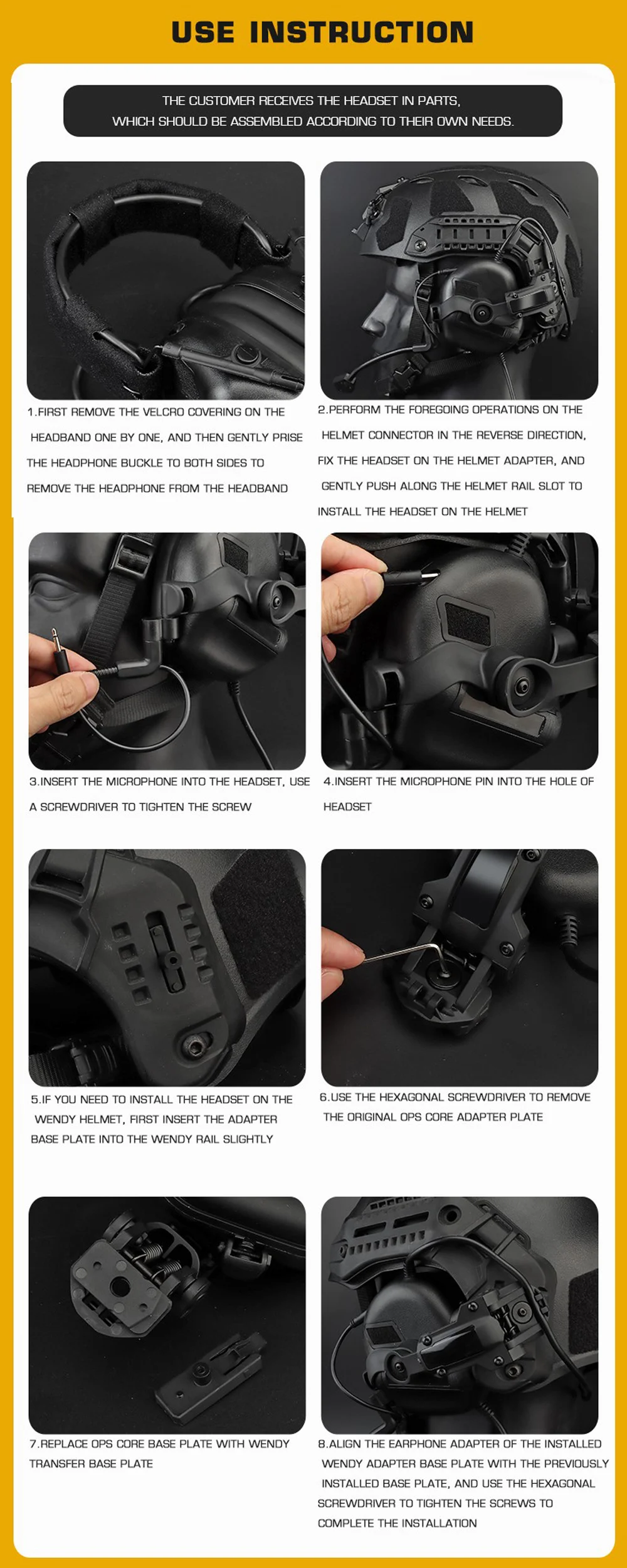 Accesorio del producto: un cuerpo del auricular, un micrófono, un par de brazos de conexión del casco, una bolsa de embalaje, un par de piezas de conversión de Riel (consulte la imagen de los accesorios para obtener más detalles)