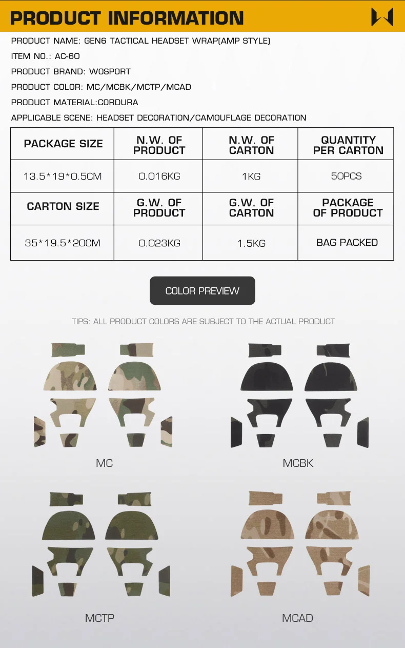 Nombre del producto: envoltura táctica para auriculares GEN6 (estilo AMP)