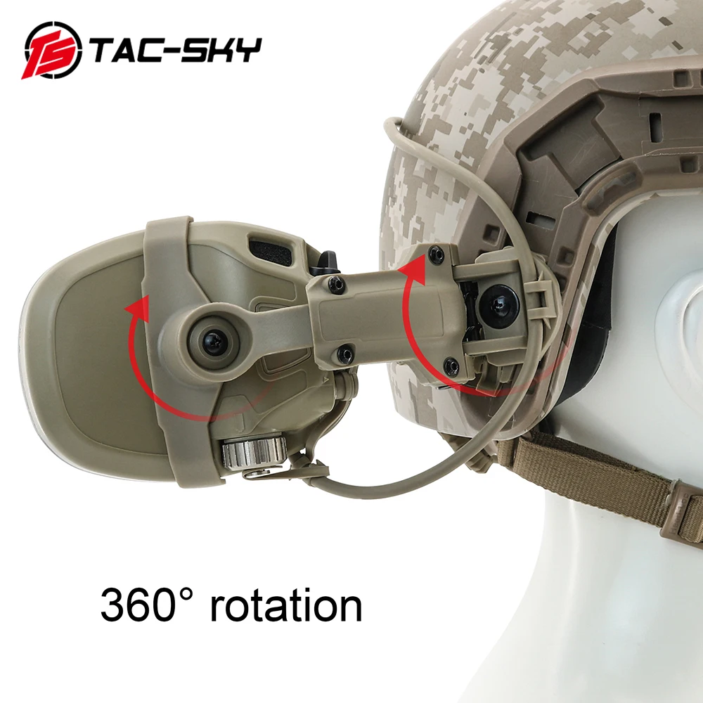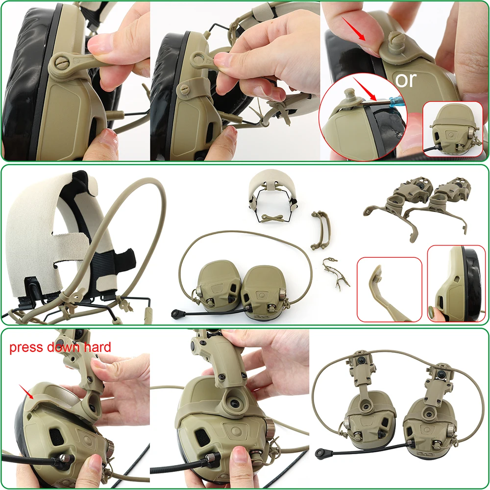 El auricular está equipado con un adaptador de pista ARC para casco, desabroche el soporte del auricular y la diadema y luego instale el adaptador del soporte del casco en el auricular. Auriculares de diadema convertidos fácilmente en auriculares de versión de soporte de casco