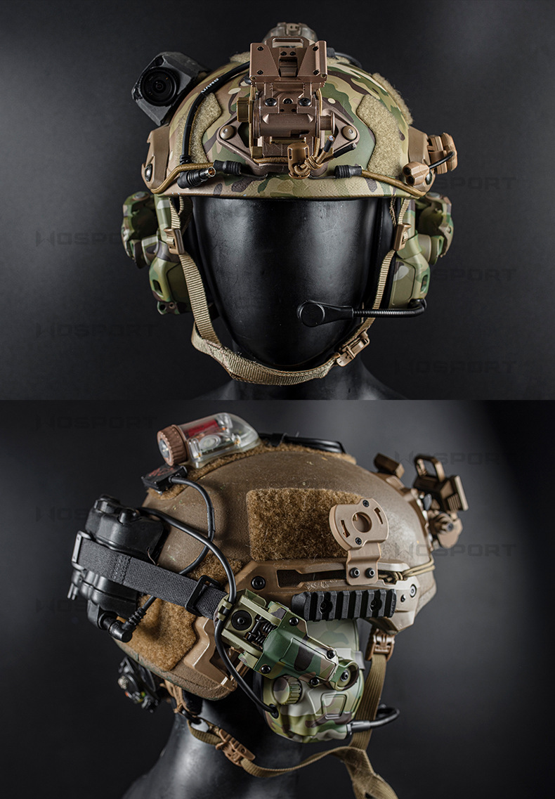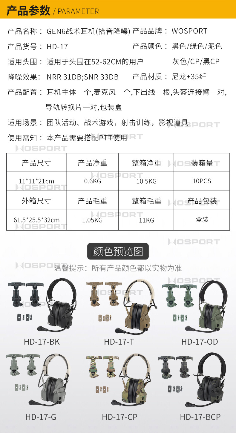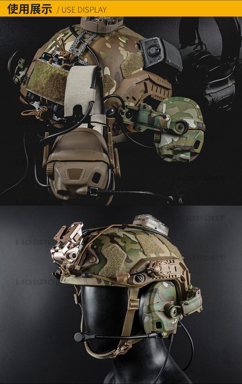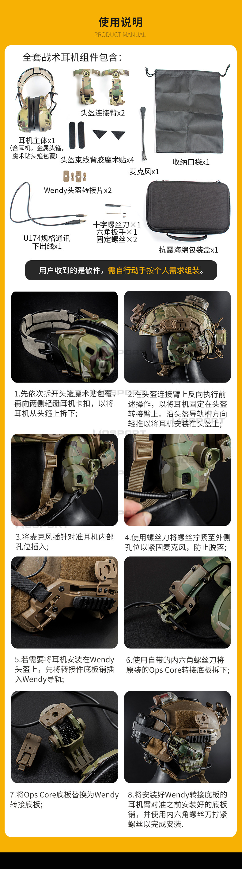 Configuración del producto: un micrófono para el cuerpo de los auriculares, un micrófono para el cuerpo de los auriculares, un par de brazos de conexión del casco para la salida fuera de línea, un par de piezas de conversión de riel guía, caja de embalaje