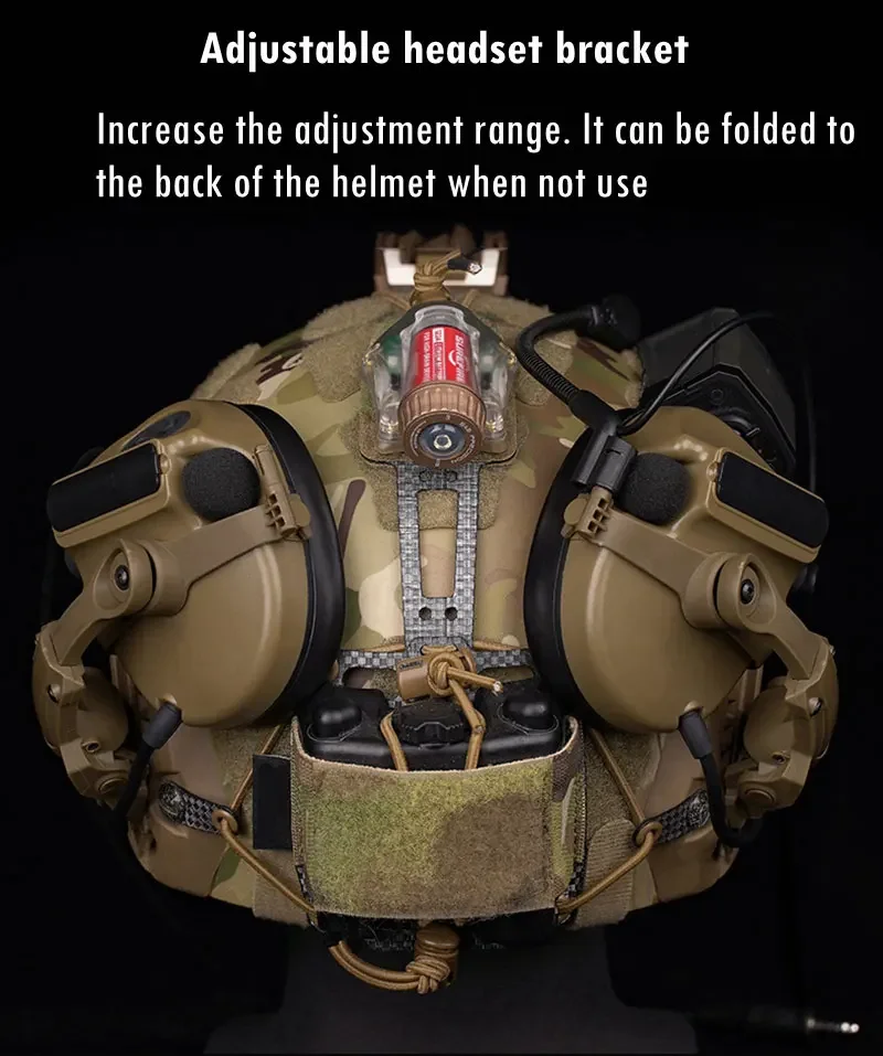●Soporte de auriculares ajustable. Aumenta el rango de ajuste. Se puede plegar en la parte posterior del casco cuando no se usa.