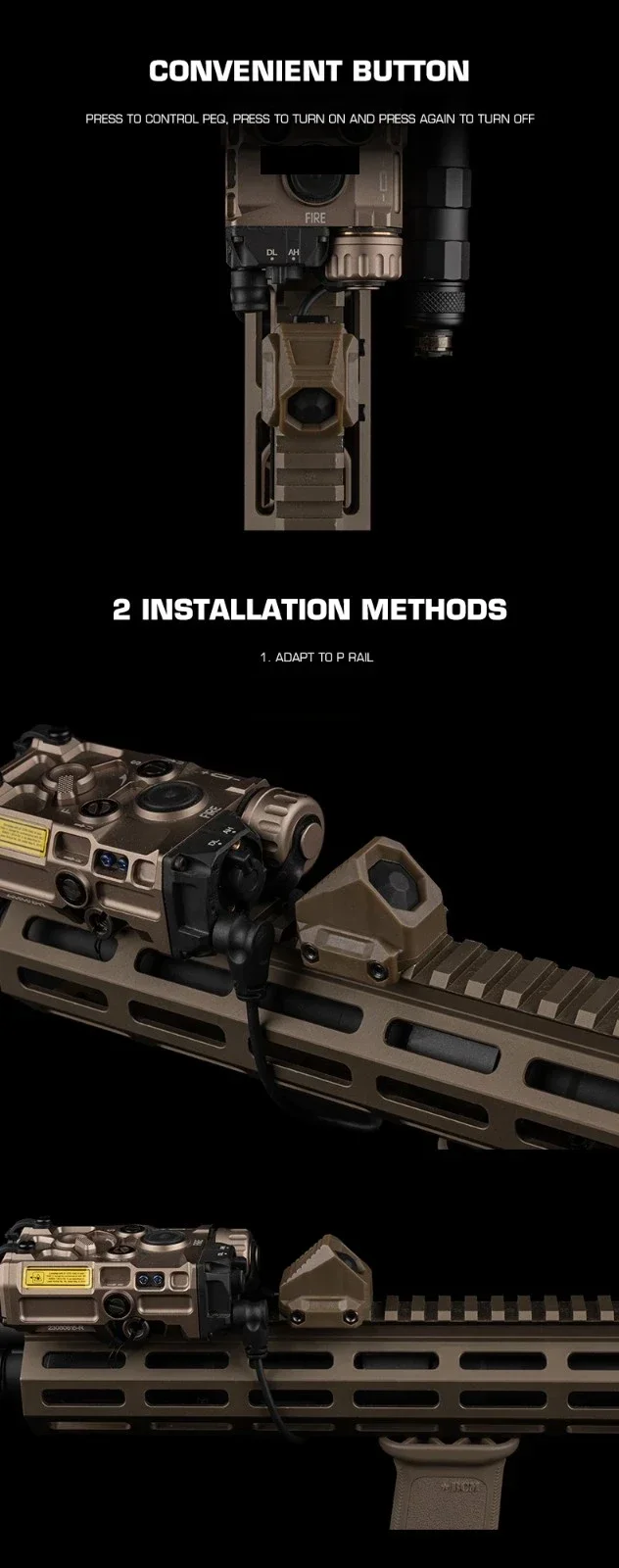 - Botones fáciles de usar para controlar PEQ o linterna.