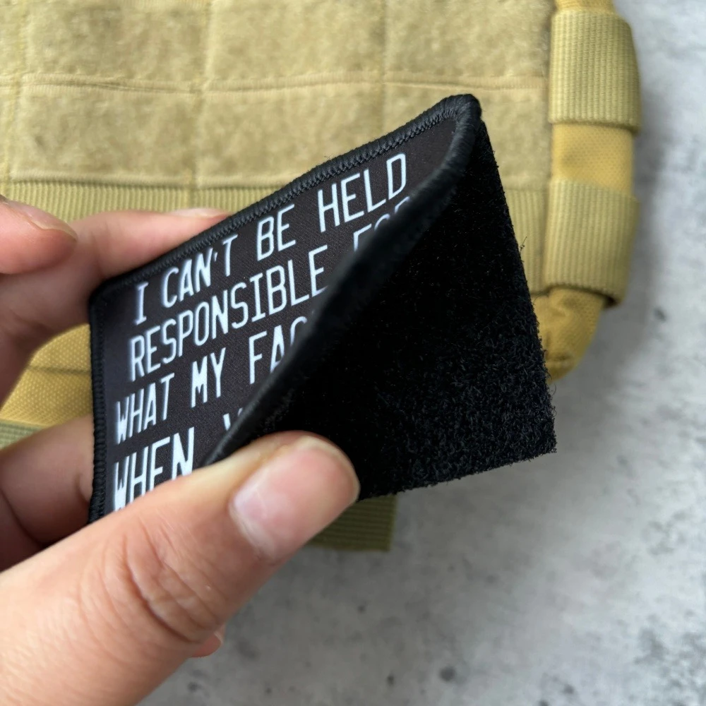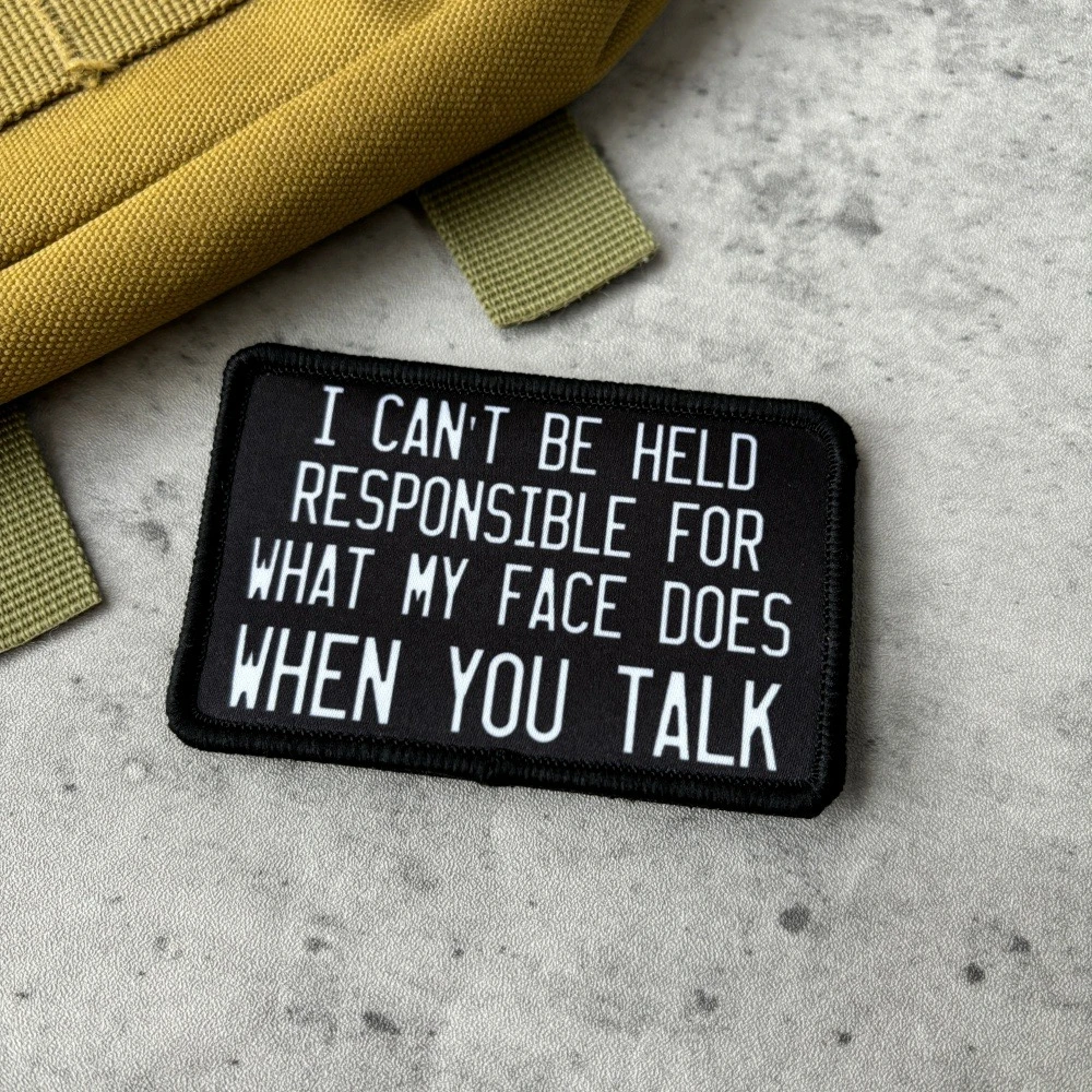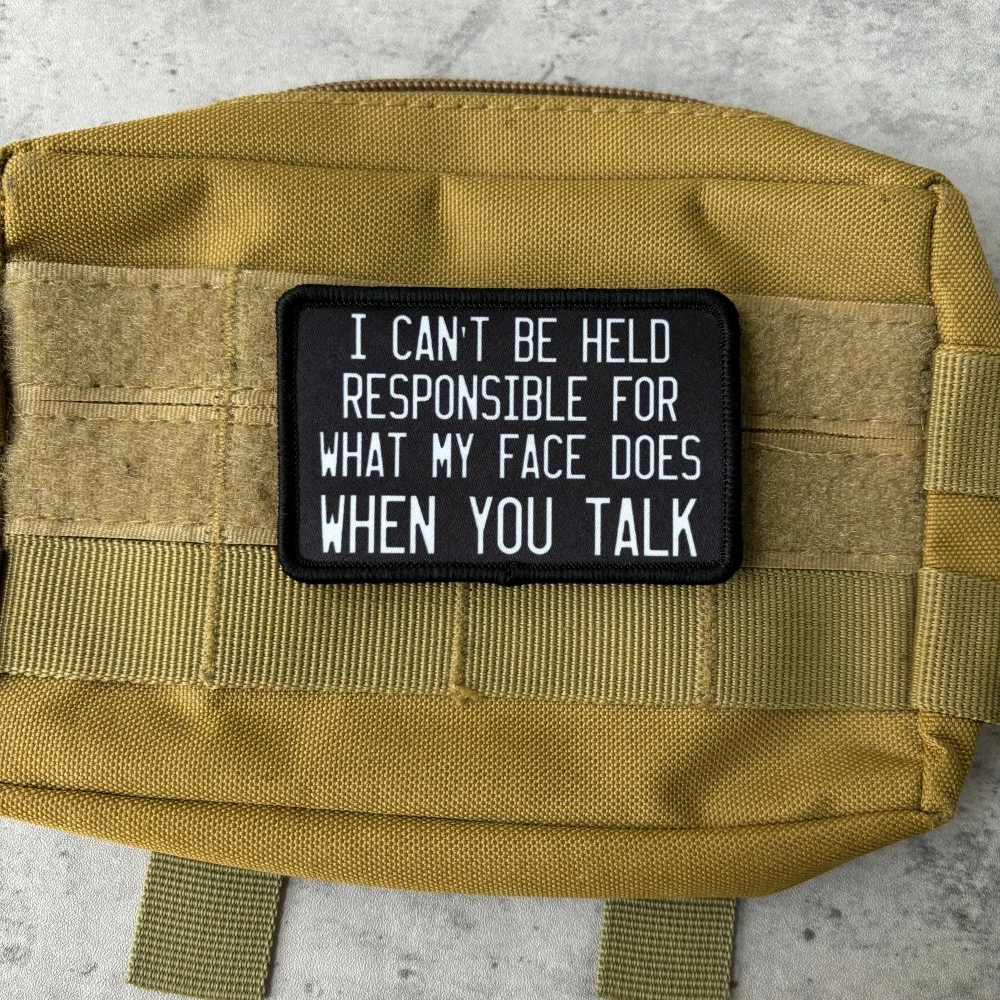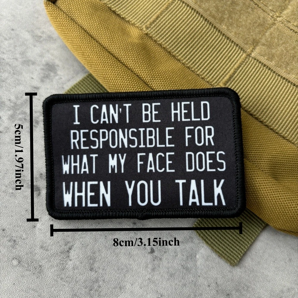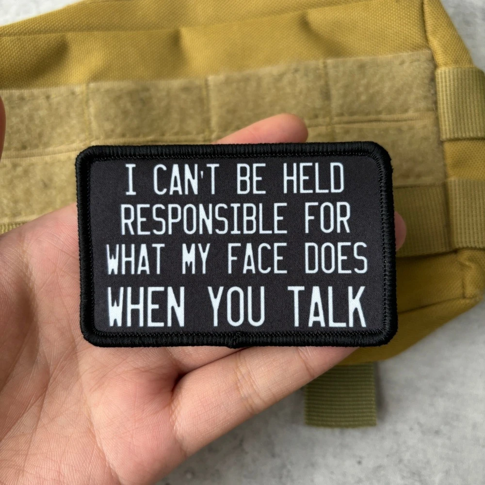 I CAN'T BE HELD RESPONSIBLE FOR WHAT MY FACE DOES WHEN YOU TALK Meme Tactical Patch Hook&Loop Patches Armband Military Army Morale Badge Backpack Stickers1. Due to the different resolutions of electronic devices, the color may be slightly different from the actual color.