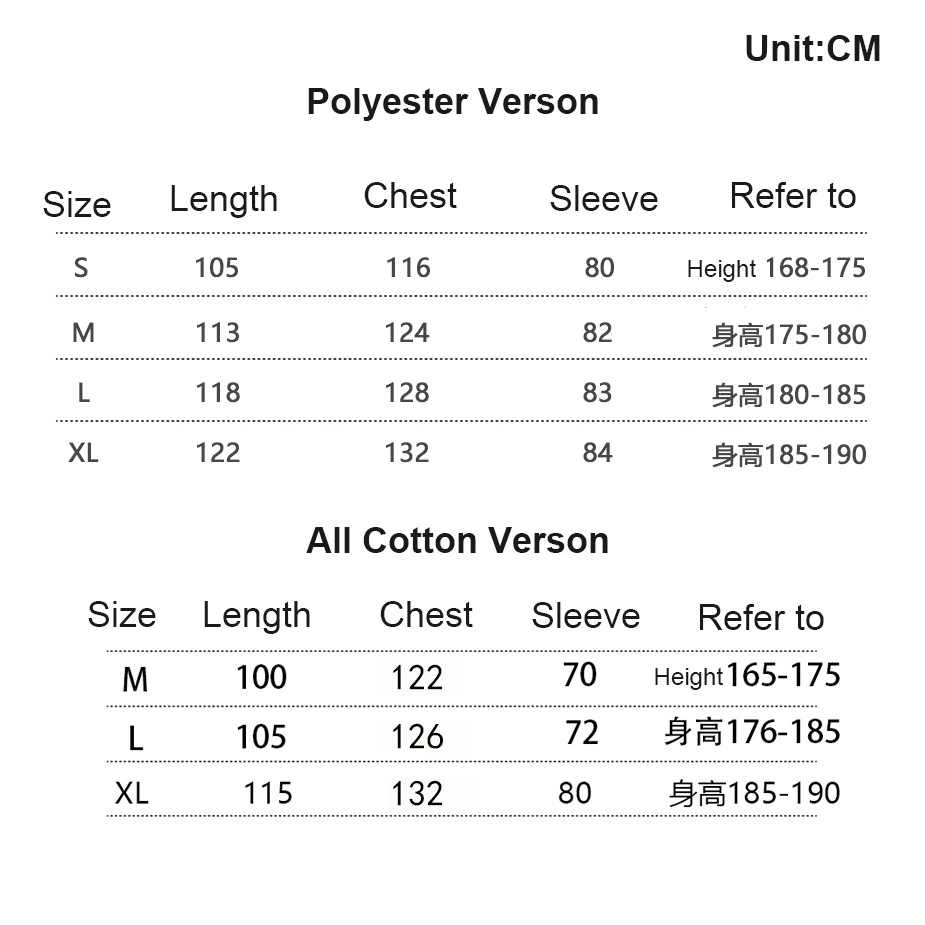 Talla XL: largo: 115 cm, pecho: 132 cm, largo de manga: 80 cm, altura: 185 cm+, peso: alrededor de 115 kg o menos.