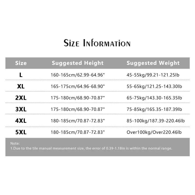 5XL-------------180-185 cm/70,87-72,83"-----------Más de 100 kg/más de 220,46 lb