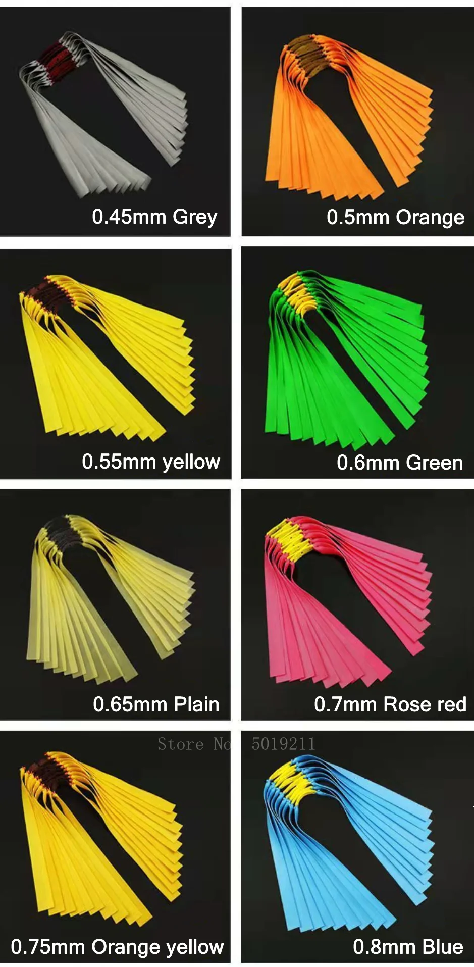 Banda elástica Color/Grosor (MM): gris/0,45, naranja/0,50, Amarillo/0,55, verde/0,60, claro/0,65, rojo/0,70, amarillo naranja/0,75, azul/0,8, (un color corresponde a un grosor)