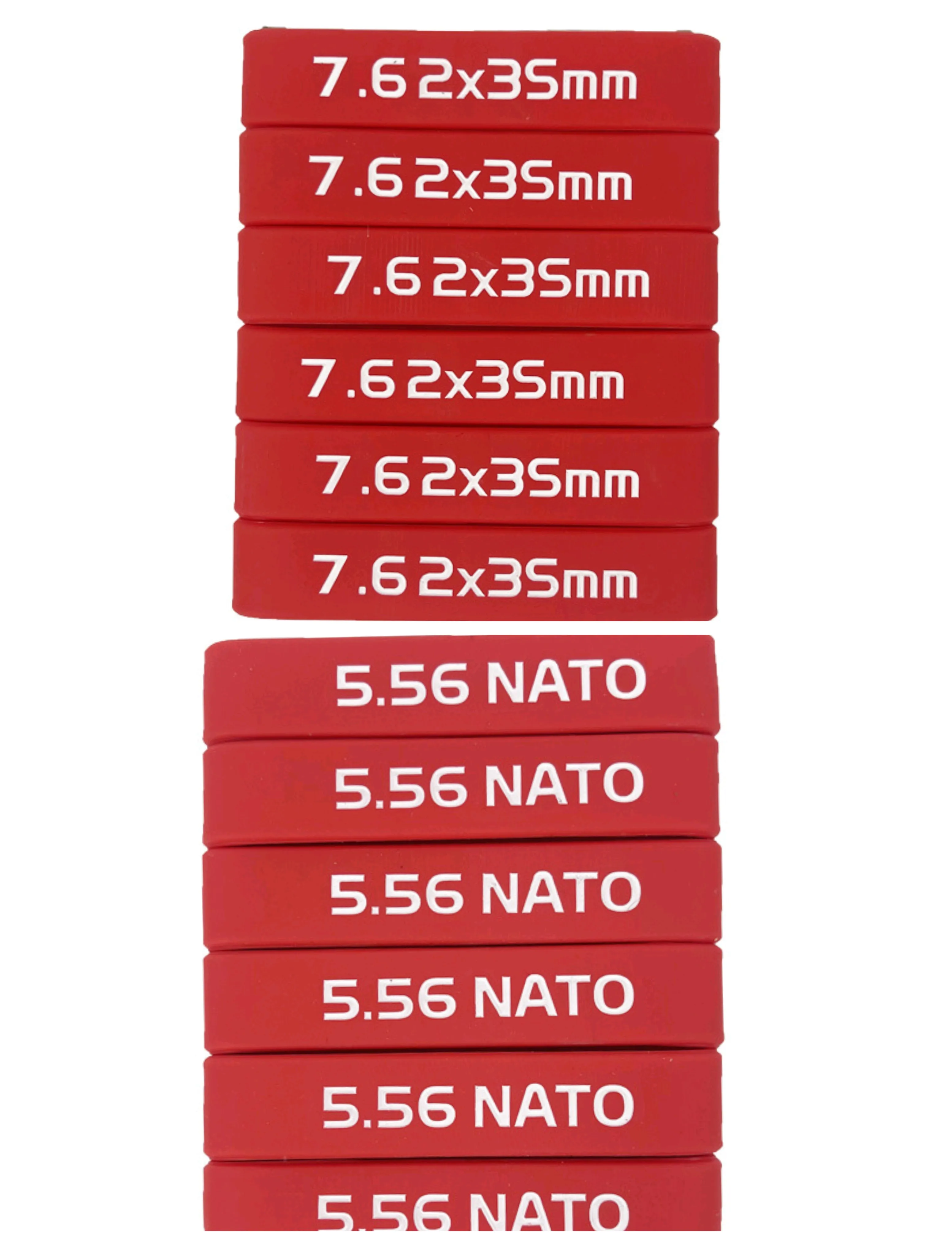 Disponible en negro, rojo, gris, azul, marrón, verde, etc.Cada color corresponde a dos marcas de munición (5,56 NATO/7,62x35 mm), lo que facilita la gestión de la clasificación.