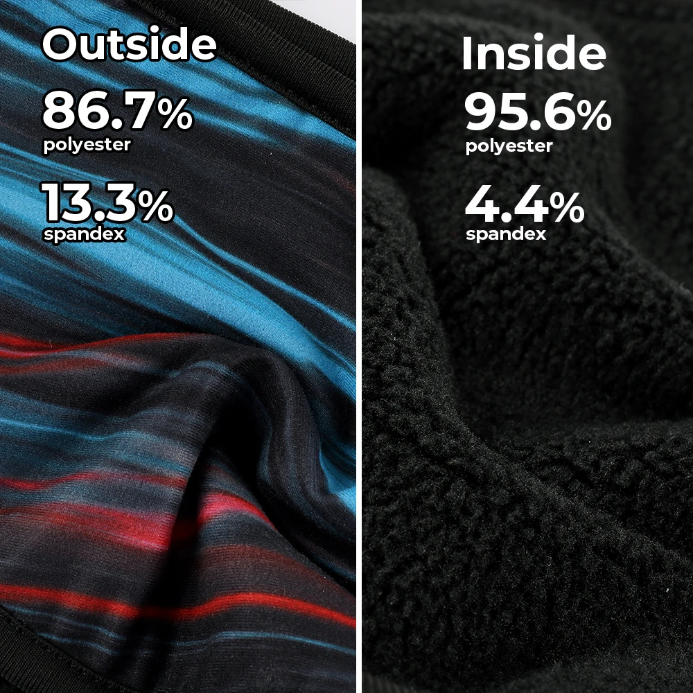 Tela térmica de dos capas, la capa exterior es 86.7% de fibra de poliéster, 13.3% de LICRA y la capa interna es 95.6% de fibra de poliéster, 4.4% de licra. Es suave y suave. Usa protectores auditivos cálidos.
