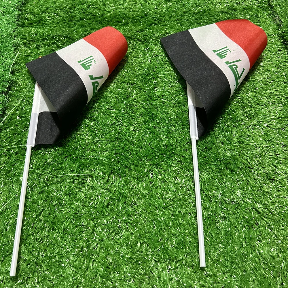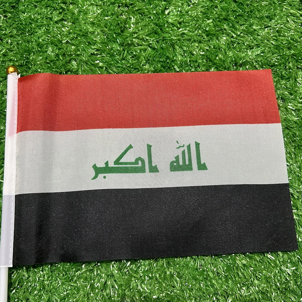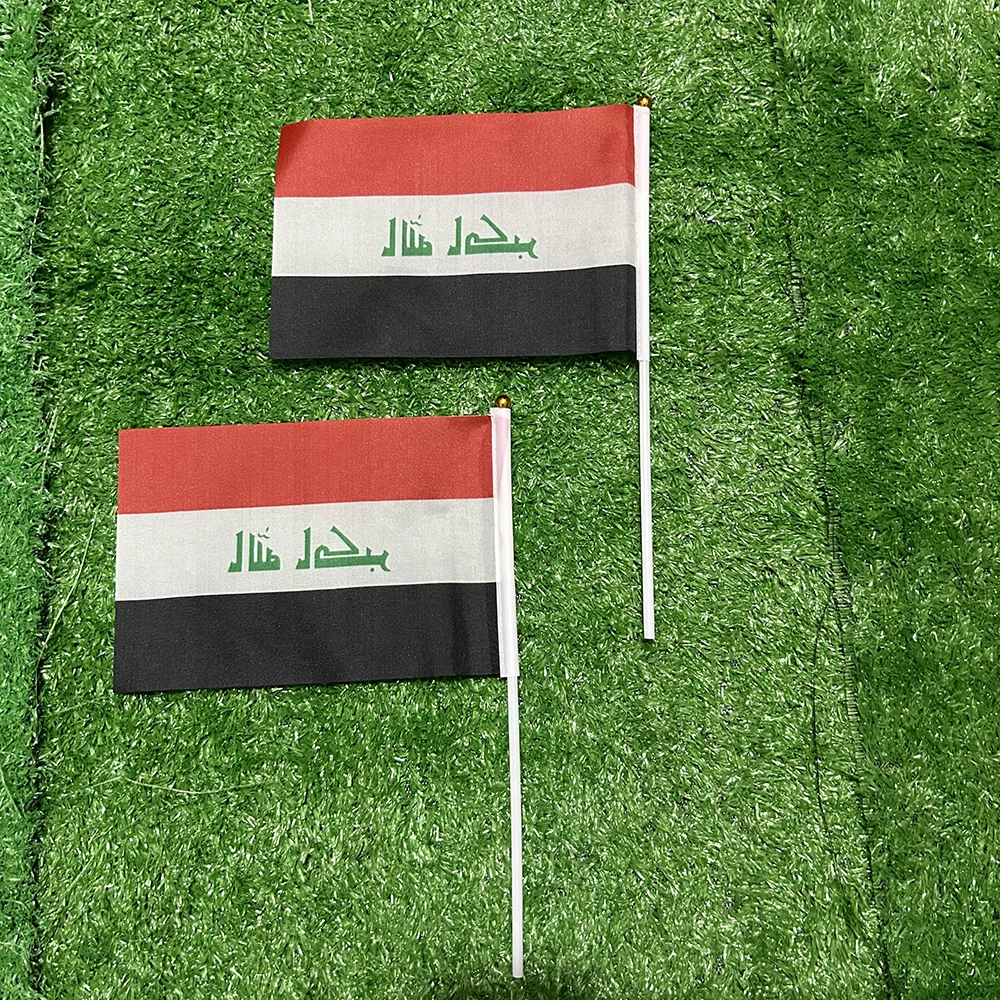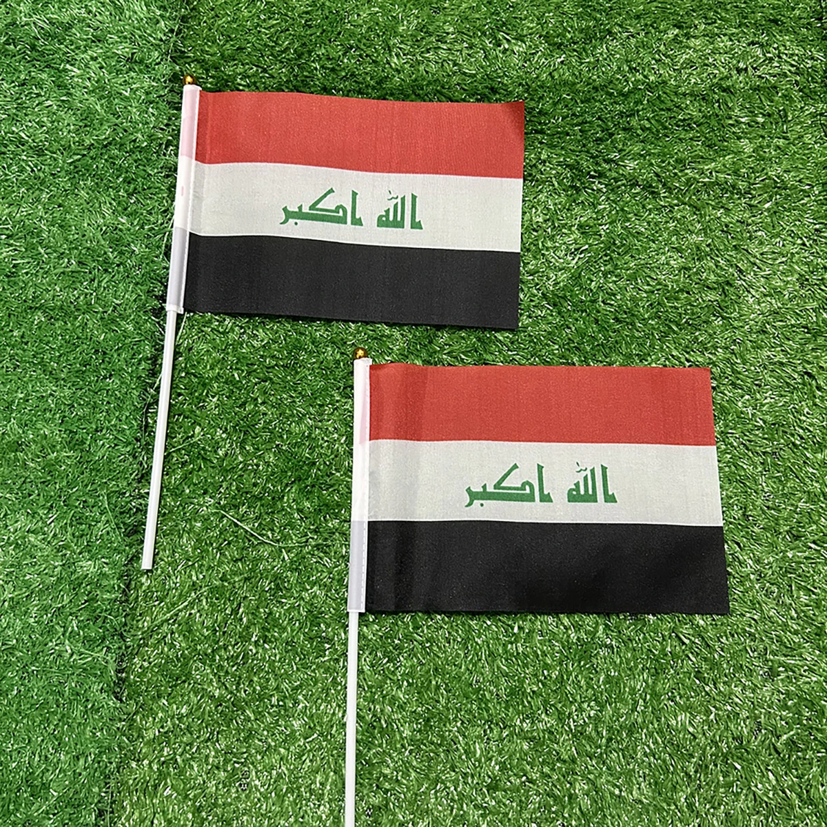 FLAG SKY Bandera de mano de Irak 14*21cm 10/20/50/100 Uds poliéster Irak Bandera pequeña de mano que agita con mástil de plástico para decoración