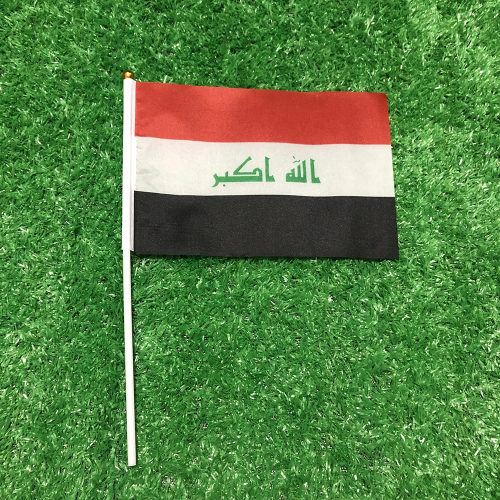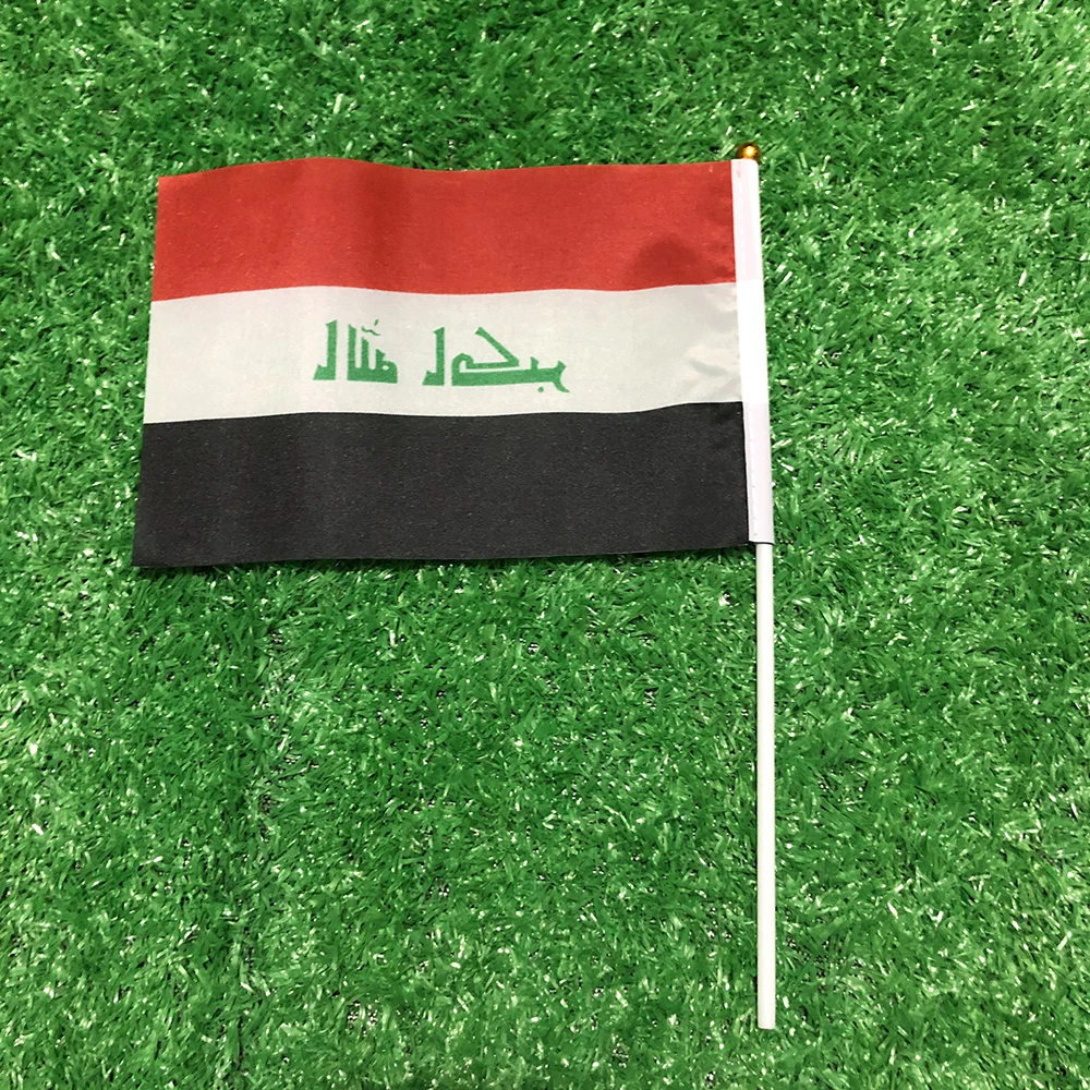 SKY FLAG bandera de mano de Irak 14x21cm 100 Uds poliéster doble penetración lateral IRQ bandera de mano de Irak con poste de plástico
