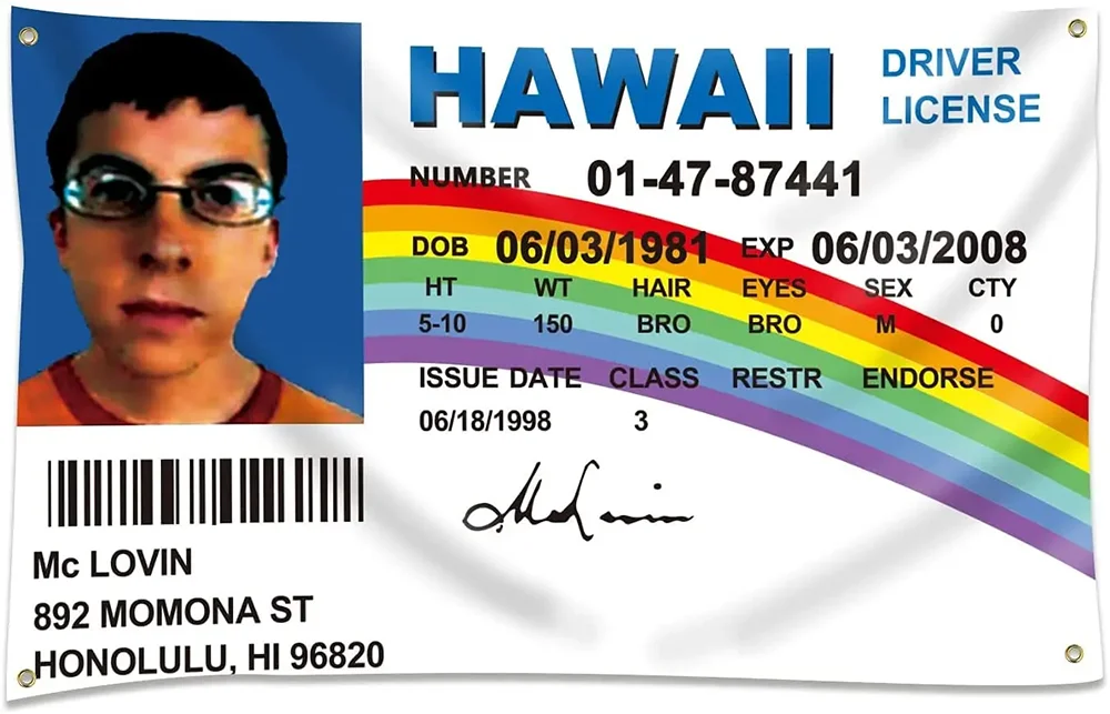 Bandera de identificación McLovin, bandera de licencia de conducir falsa, pancarta 3x5, póster divertido, decoraciones duraderas, bandera de pared con 4G para decoración del dormitorio universitario.