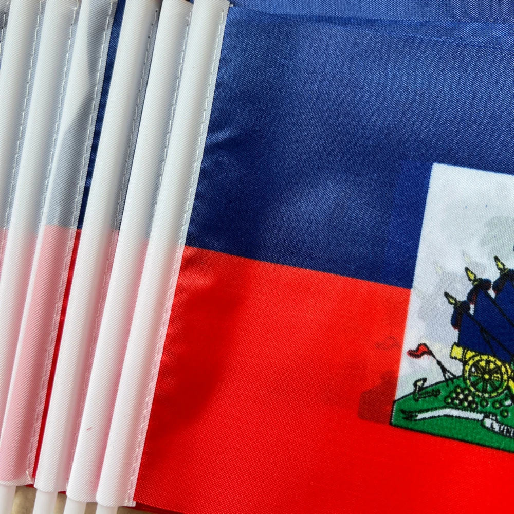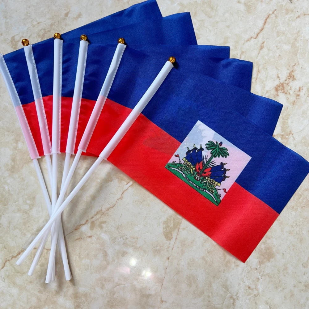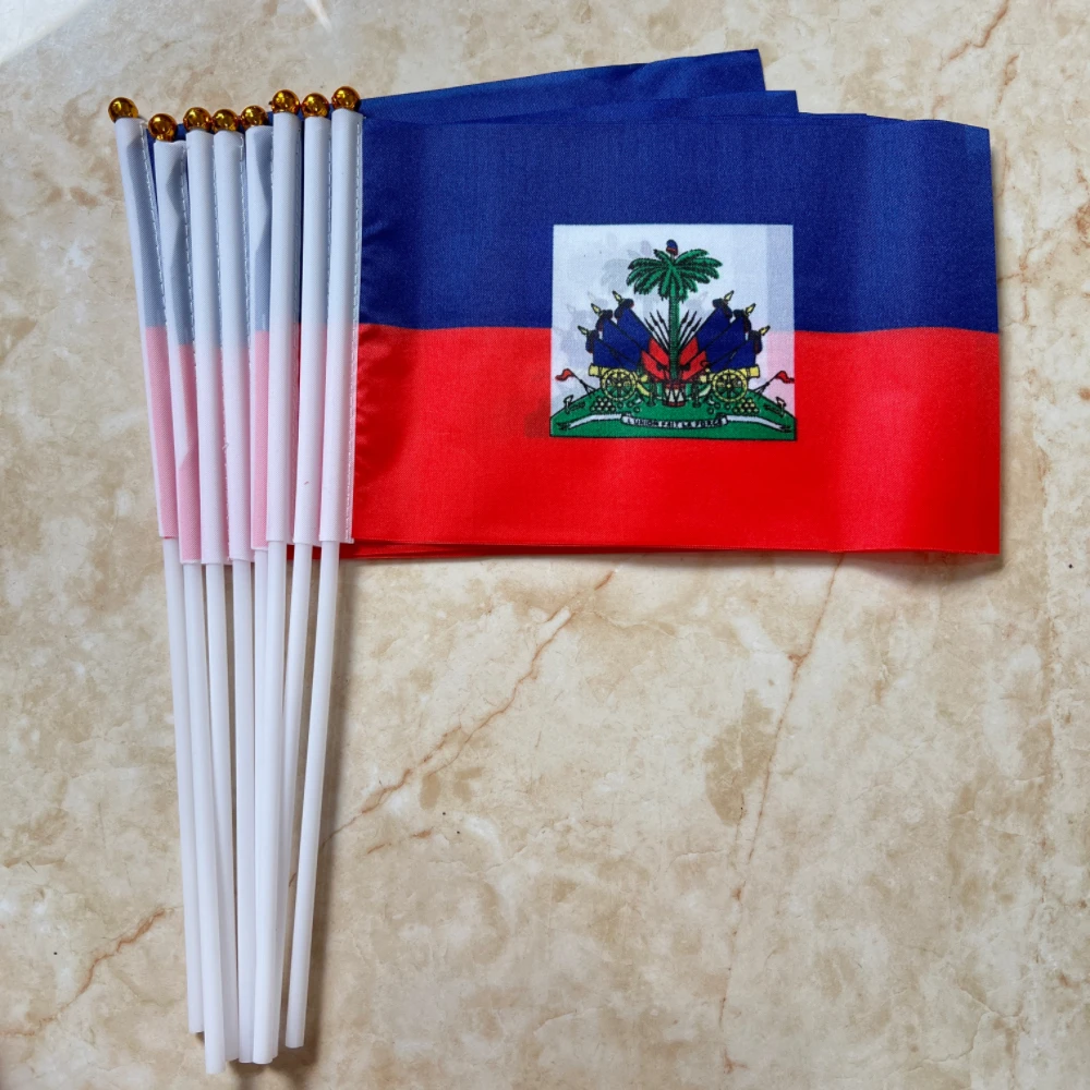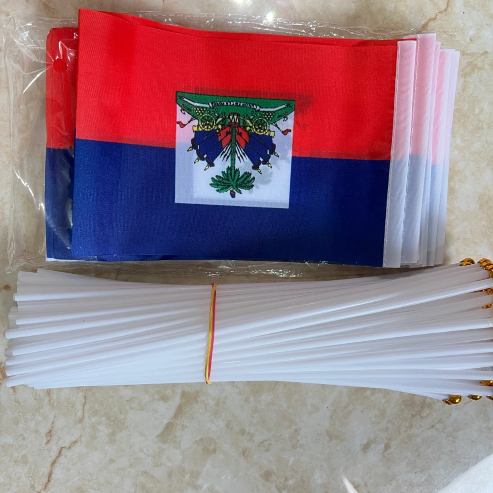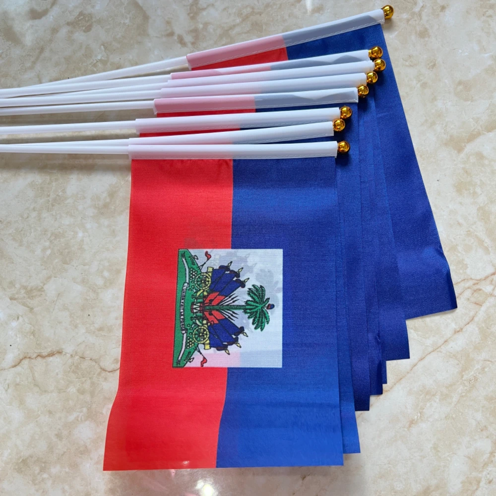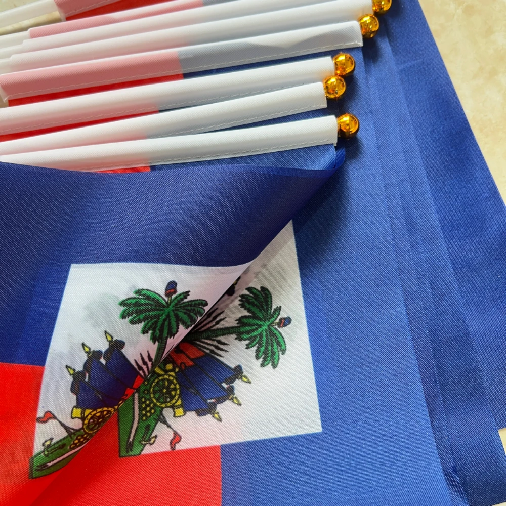 Bandera de mano de Haití 14x21cm poliéster Bandera de mano de Haití con asta de bandera de plástico para Decoración