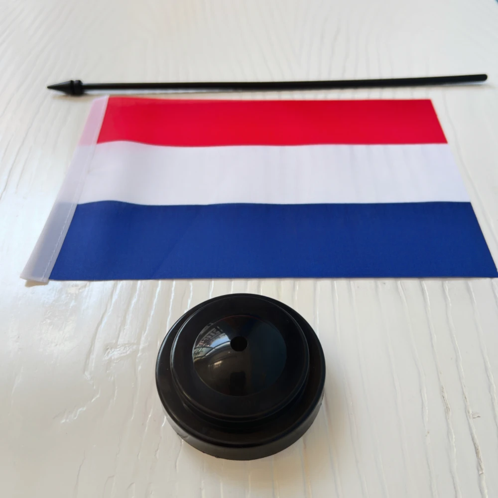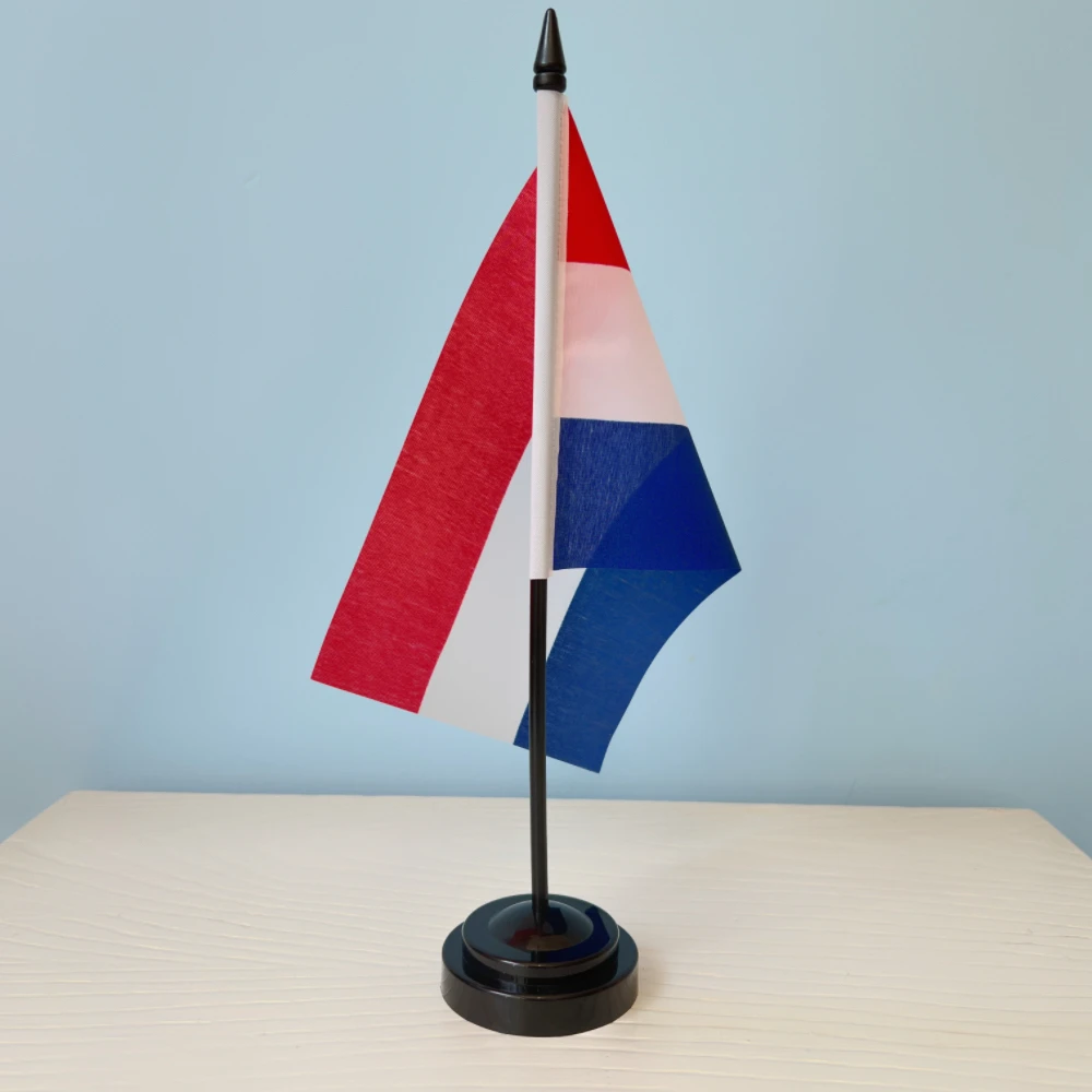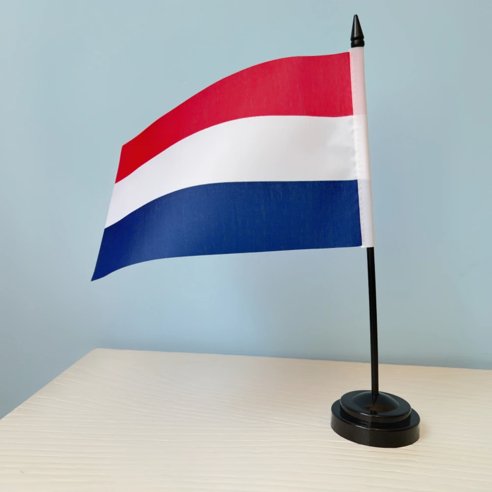 Bandera de los Países Bajos, bandera de 14x21cm/base de poste de plástico, bandera de escritorio de mesa de oficina de Países Bajos con base de mástil de bandera negra