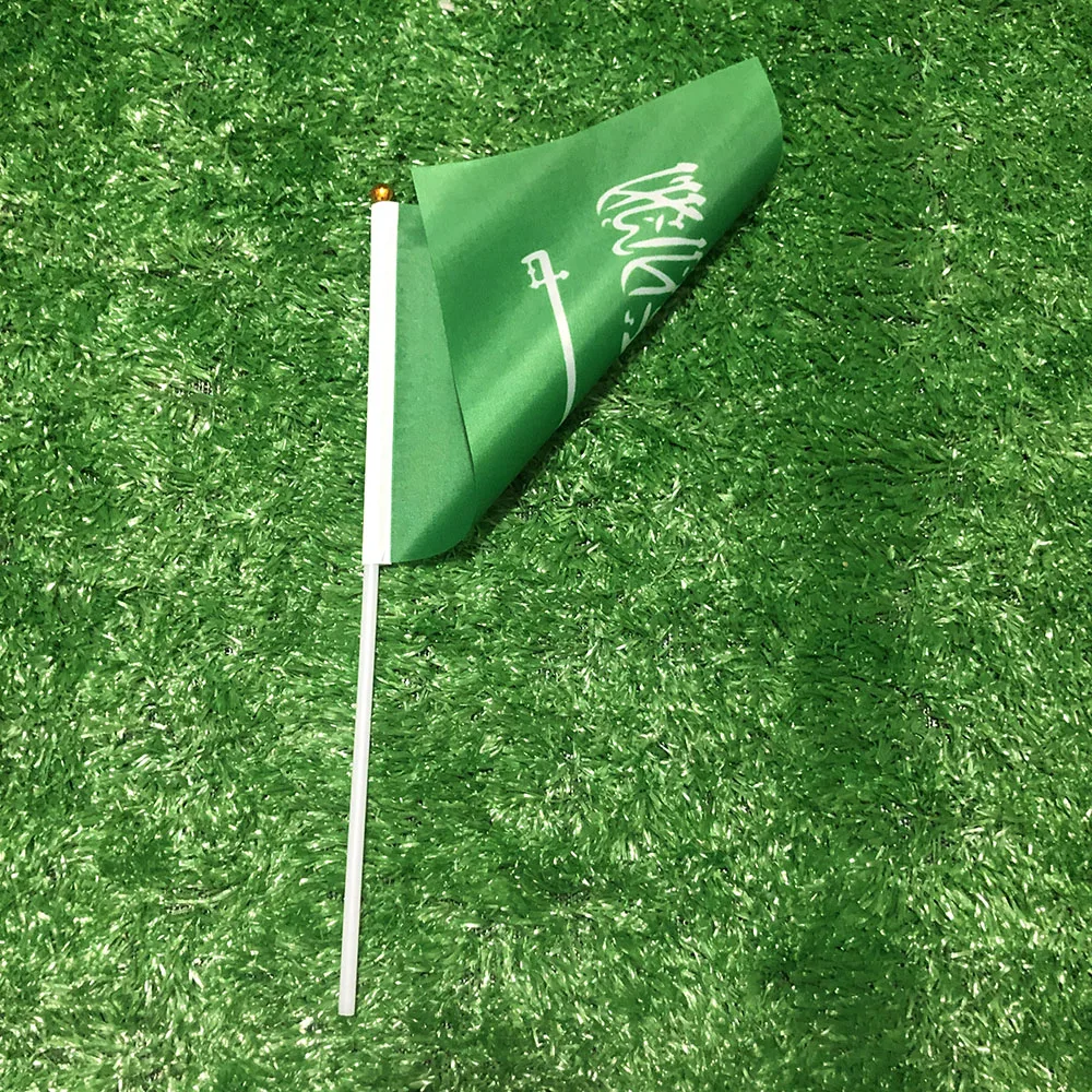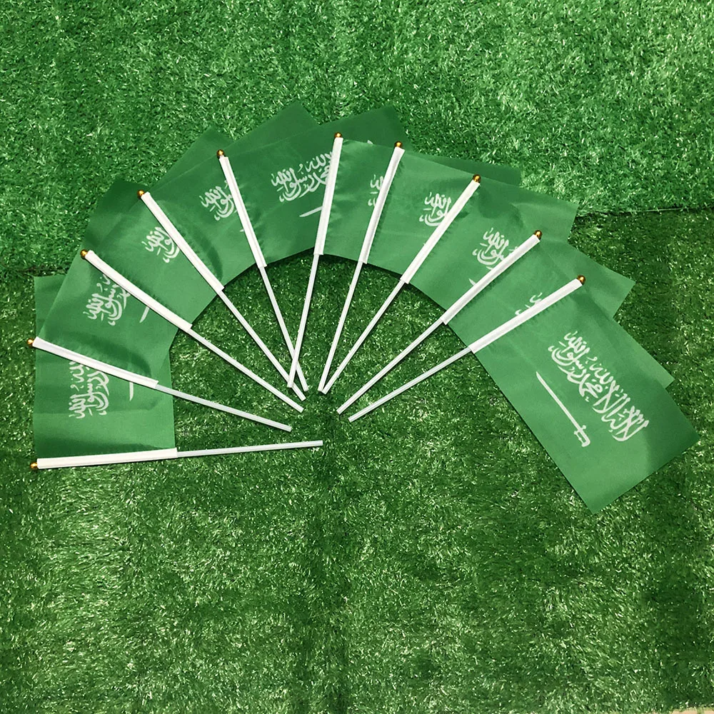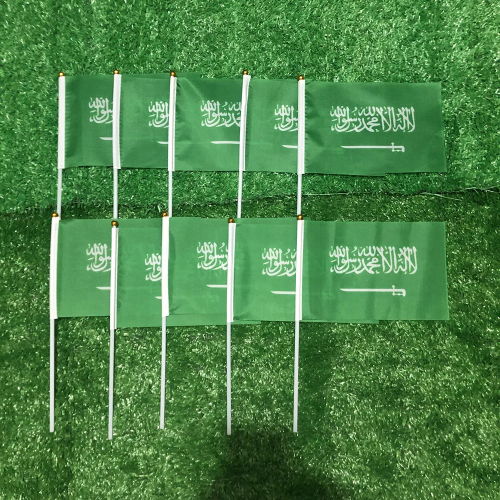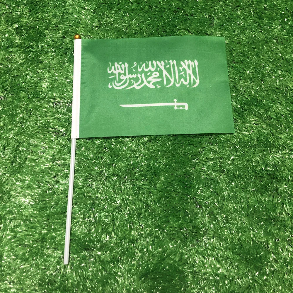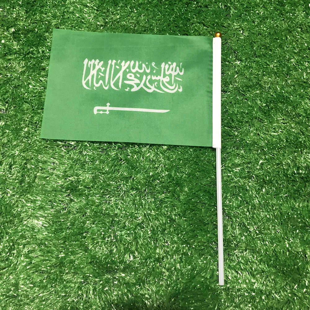 SKY FLAG Bandera de mano de Arabia Saudita 14x21cm 100 Uds poliéster doble penetración de doble cara Bandera de mano de Arabia Saudita para decoración
