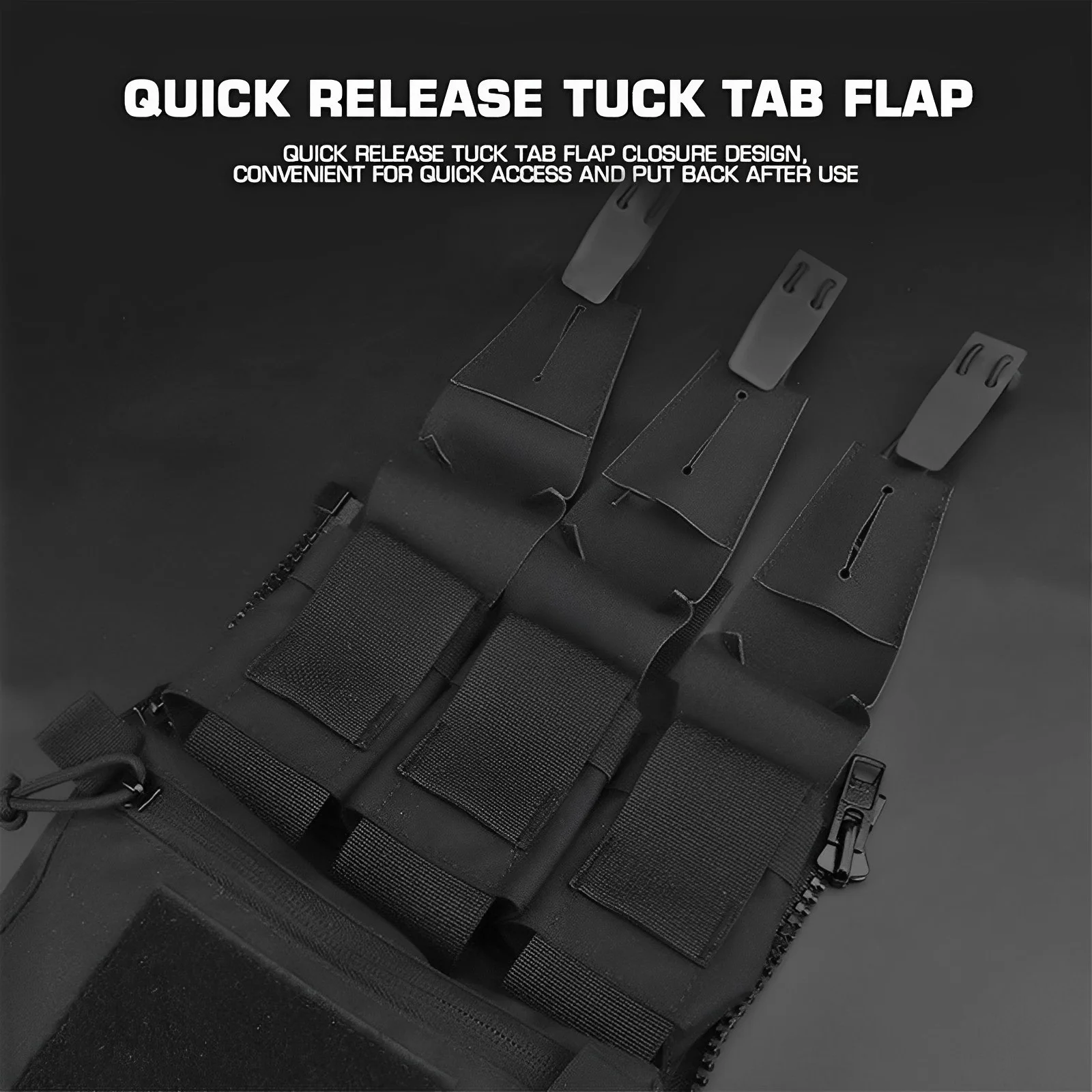 ▶Las solapas de retención no solo son ajustables, sino que también son completamente extraíbles. Y asegurarán el contenido de los bolsillos con un innovador sistema de cierre silencioso con lengüeta.