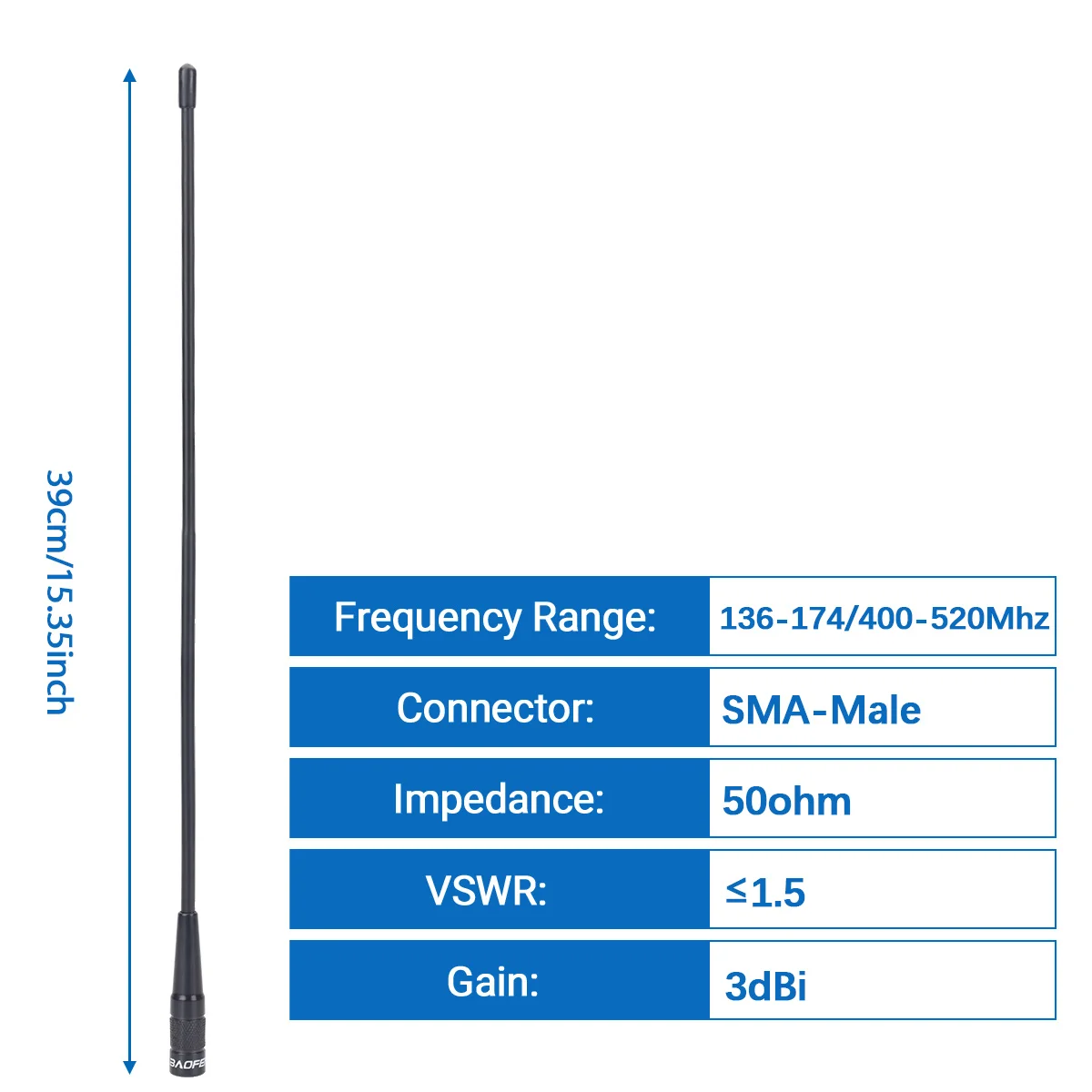 📢【Características】 Tipo de conector: SMA-Cabeza macho; Rango de frecuencia: 136-174/400-520 Mhz; Ganancia: 3dBi; Potencia máxima: 20W; Valor V. S.W.R: menos de 1,5; Impedancia: 50 ohmios