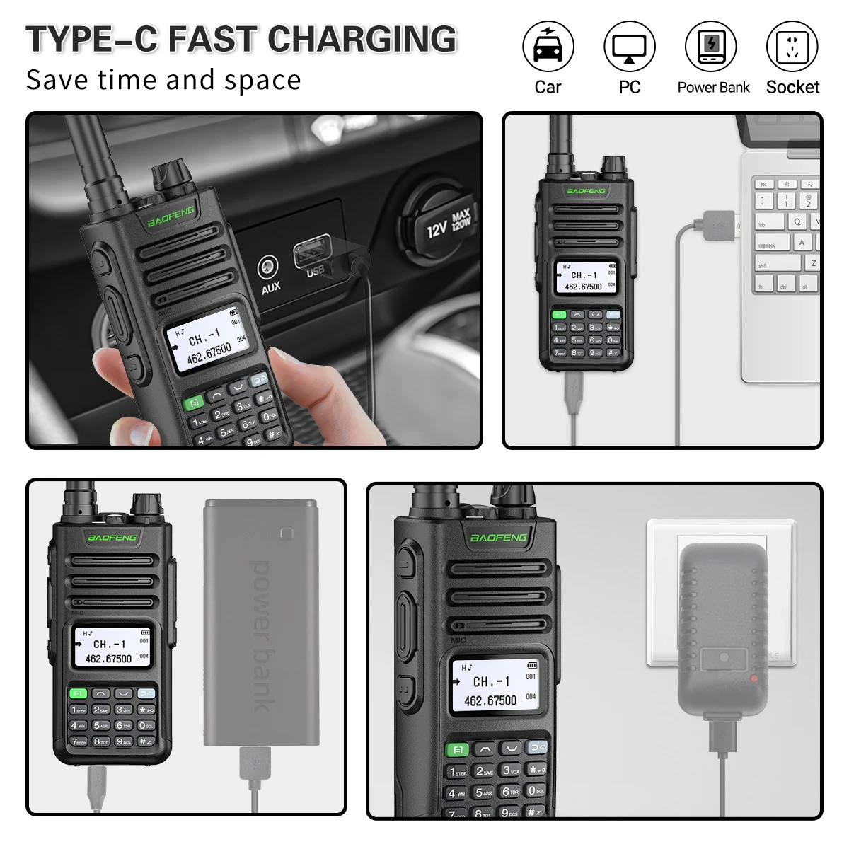 • Soporte Tipo C Carga:El walkie talkie admite carga de tipo C, que es más rápido y más eficiente que los cargadores tradicionales.