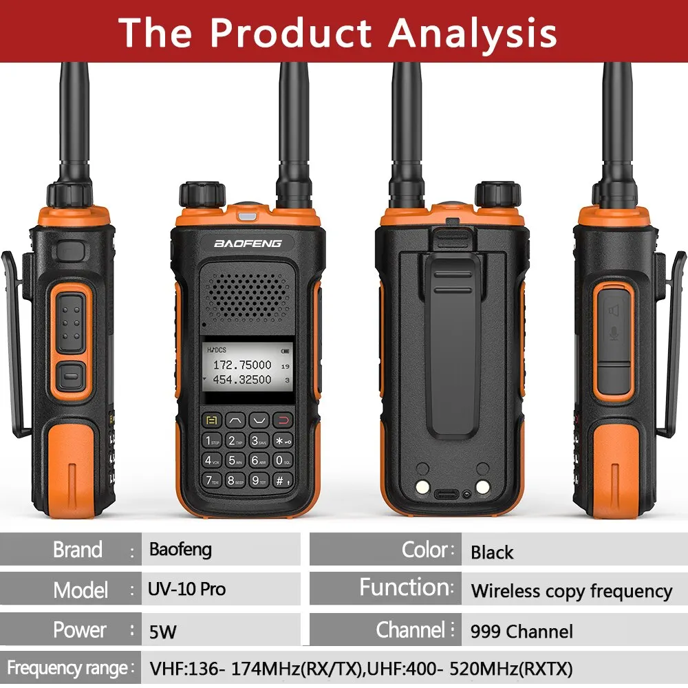 UV-10 Pro es una radioaficionada profesional de alta potencia.Hasta 999 canales. Pantalla a color de 1,44 pulgadas.【Frecuencia]]136-174MHz/400-480Mhz