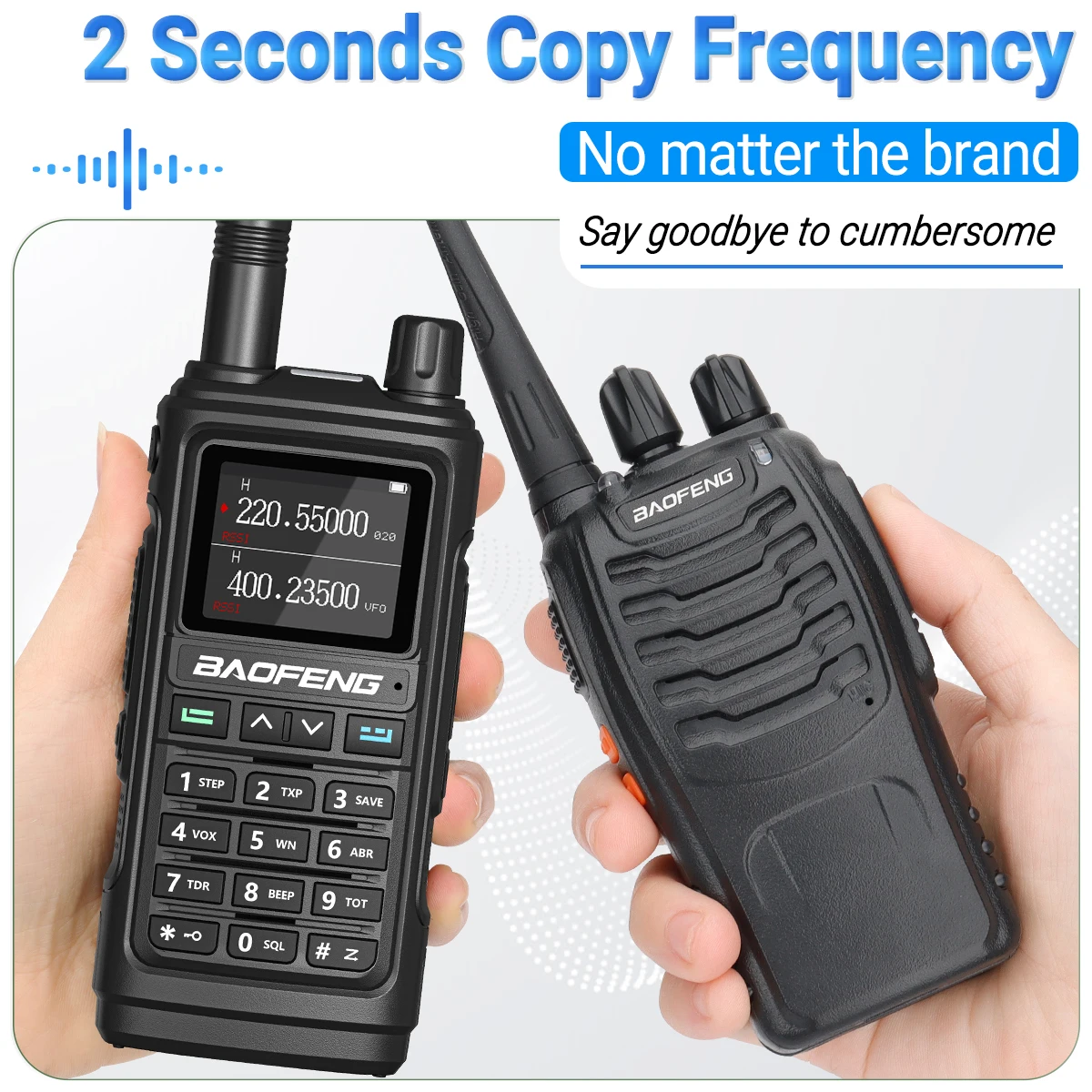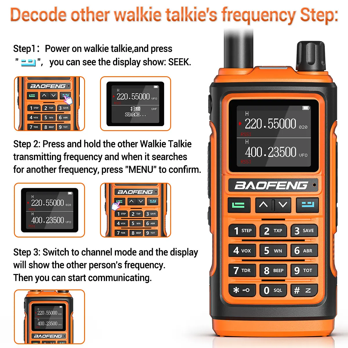 Presione el botón de menú para ingresar a la interfaz "FQSCAN".Presione Menú nuevamente y el UV-17L Pro buscará otra frecuencia de transmisión de radio y código de privacidad.Finalmente presione el menú para almacenar la frecuencia.Dos walkie-talkies pueden comunicarse normalmente.La comunicación no tiene obstáculos y se rechaza la frecuencia de escritura tradicional.★【Pantalla incorporada】