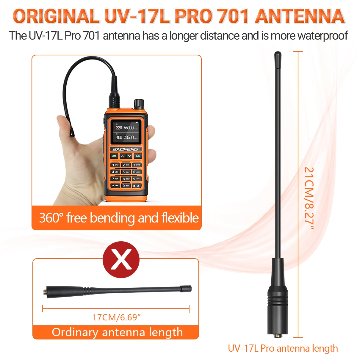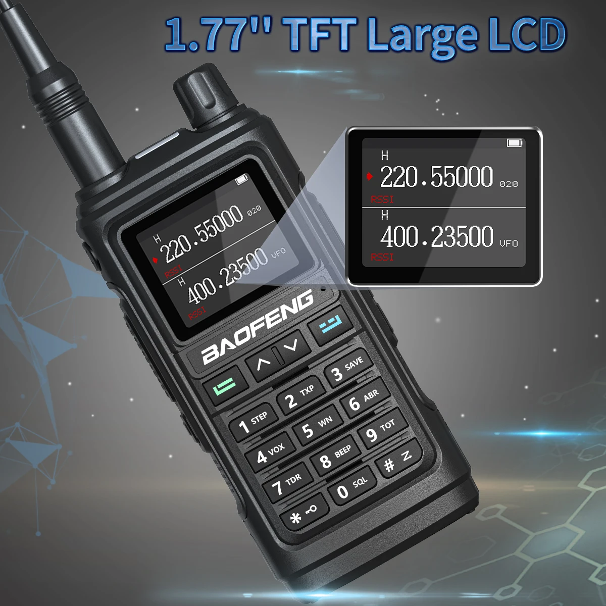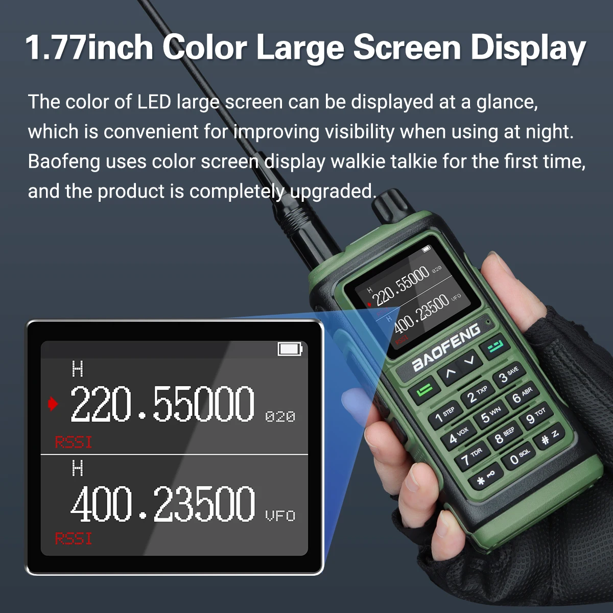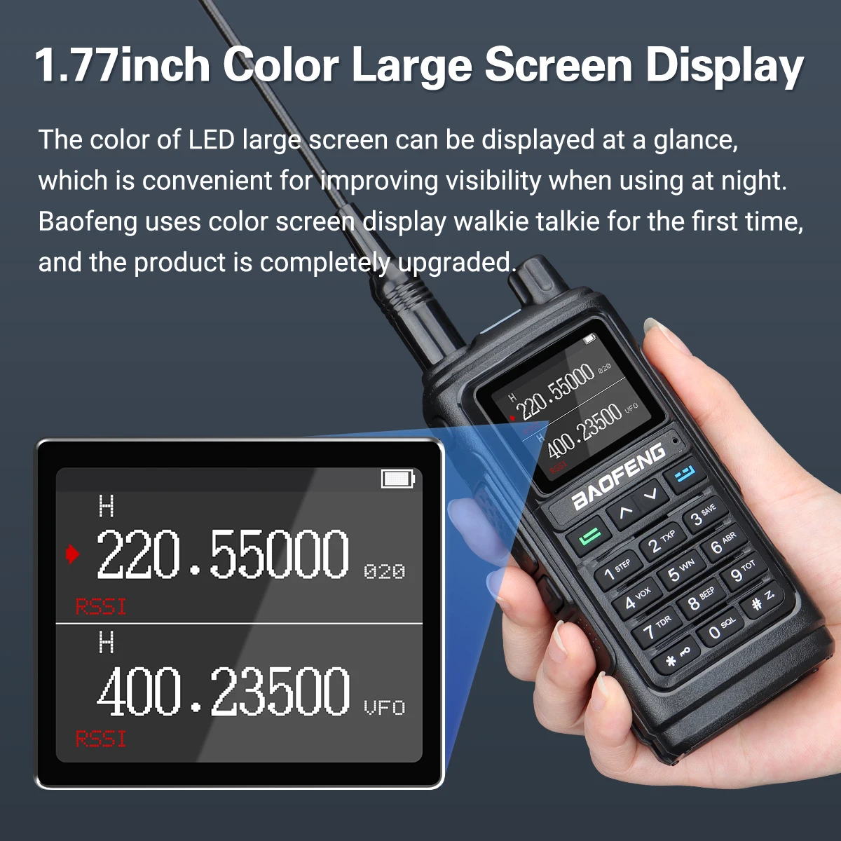Nueva tecnología negra de tendencia Pantalla grande de alta definición de 1,77 pulgadas.Hay 2 modos de visualización diferentes de frecuencia y canal para satisfacer sus diferentes necesidades.Todos los menús de funciones de visualización en la pantalla.Como VOX/FM/CT, etc.★【Linterna LED】