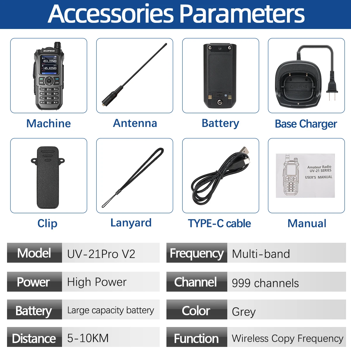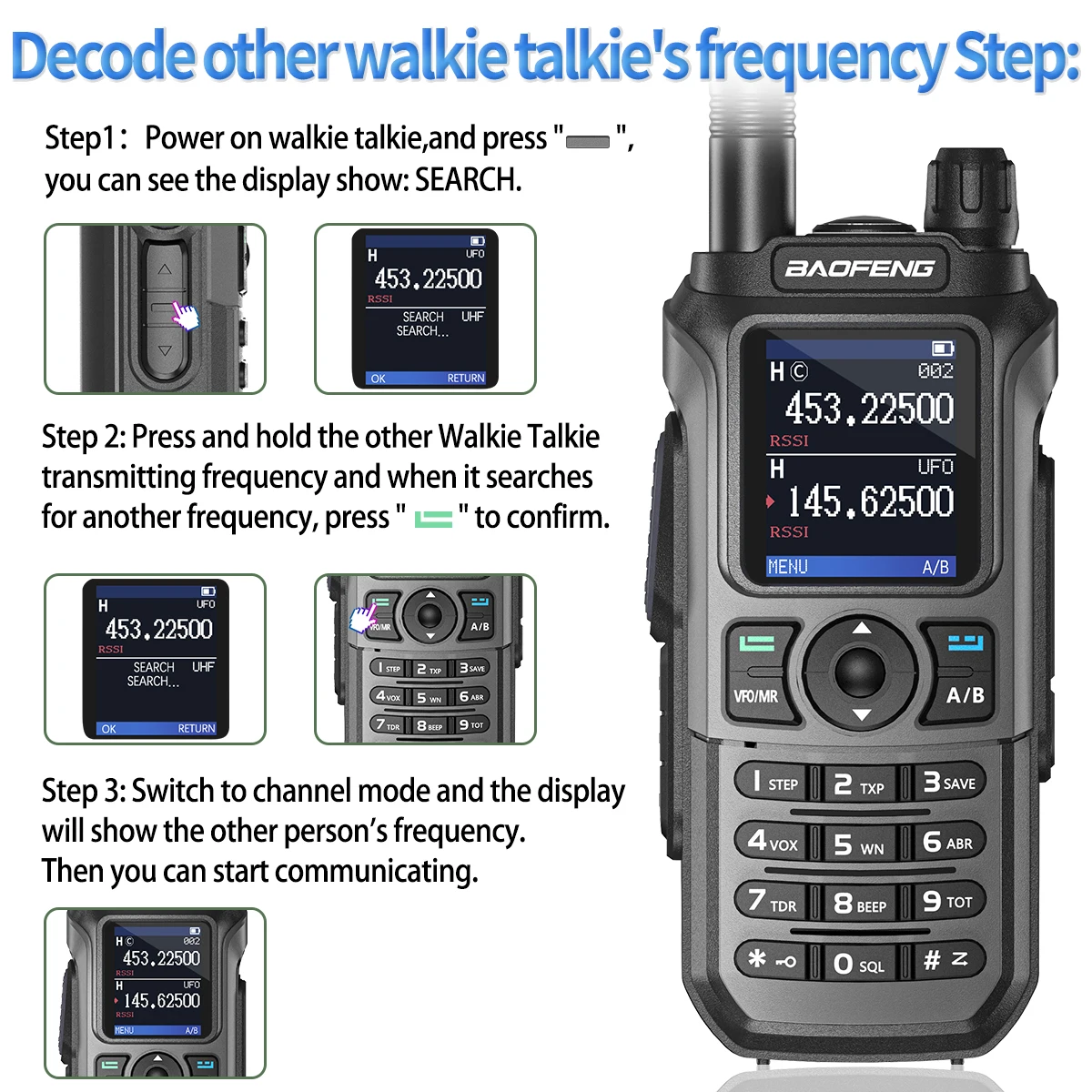 Presione el botón de menú para ingresar a la interfaz "FQSCAN".Presione Menú nuevamente y el UV-21 Pro V2 buscará otra frecuencia de transmisión de radio y código de privacidad.Finalmente presione el menú para almacenar la frecuencia.Dos walkie-talkies pueden comunicarse normalmente.La comunicación no tiene obstáculos y se rechaza la frecuencia de escritura tradicional.★【Pantalla incorporada】