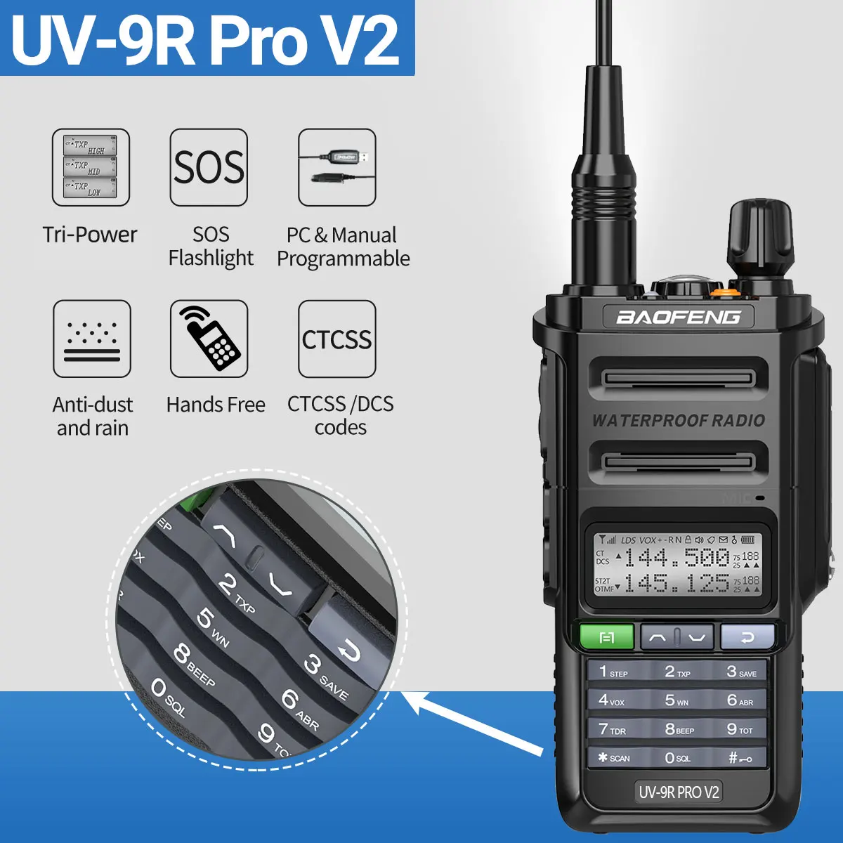 Baofeng UV-9R ProV2 es la actualización de UV-9R Pro. Hay Tri-Power que se puede cambiar para satisfacer diferentes necesidades en diferentes situaciones.