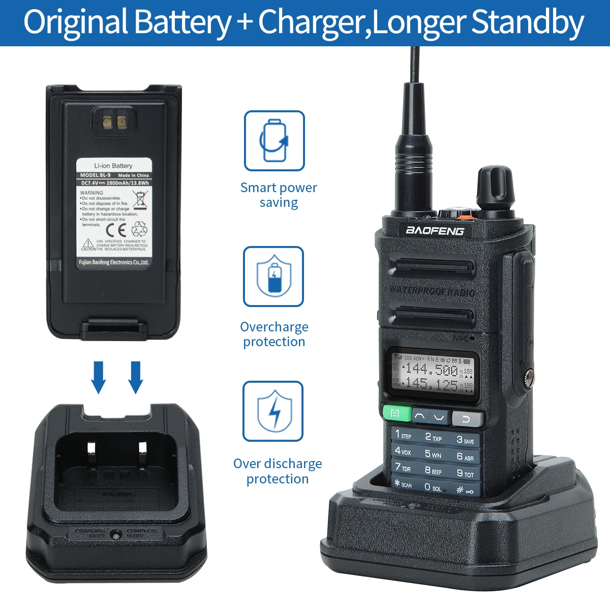 ★Más características y fuente de energía:Tres modos de alta/media/baja potencia, doble pantalla y Doble Modo de espera, U/V banda cruzada dual reloj 50 CTCSS y 104Dcs códigos.