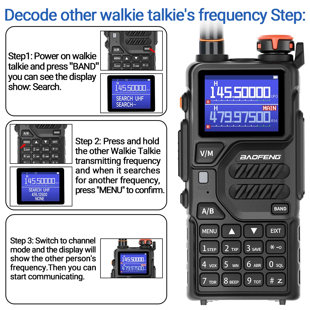 Presione el botón BAND para ingresar a la interfaz “SEARCH”. Y el UV-K5 Pro buscará otra frecuencia de transmisión de radio y Código de Privacidad. Por Último, pulse el menú para almacenar la frecuencia. Dos walkie-talkies pueden comunicarse normalmente. La comunicación no es obstruida, y la frecuencia de escritura tradicional es rechazada.