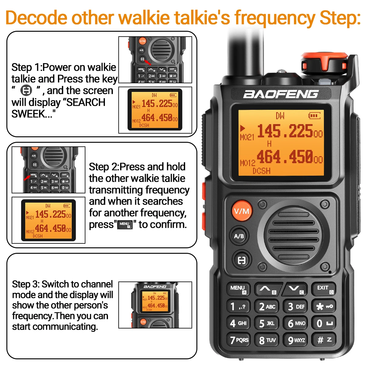 Presione el botón para ingresar a la interfaz "BUSCAR". Presione nuevamente y el UV-K6 buscará otra frecuencia de transmisión de radio y Código de Privacidad. Finalmente, presione el menú para almacenar la frecuencia. Dos walkie-talkies pueden comunicarse normalmente. La Comunicación no se obstruye y se rechaza la frecuencia de escritura tradicional.