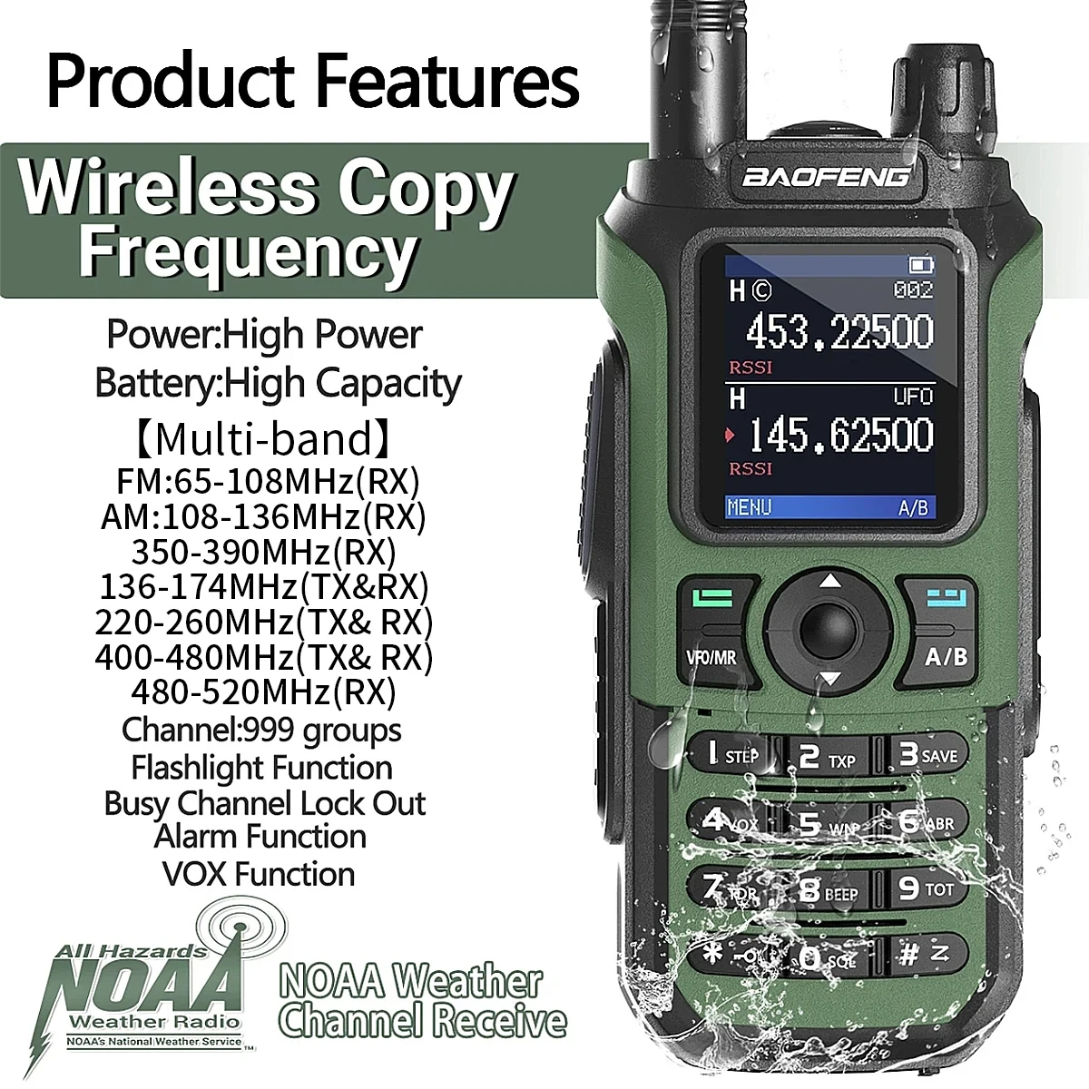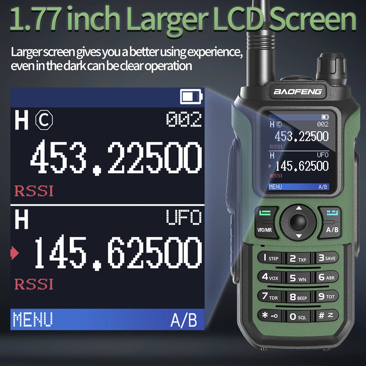 Nueva tendencia, tecnología negra, pantalla grande de alta definición de 1,77 pulgadas. Hay 2 modos de visualización diferentes de frecuencia y canal para satisfacer sus diferentes necesidades.Todos los menús de función de visualización en la pantalla. Como VOX/FM/CT, etc.★【Linterna LED】