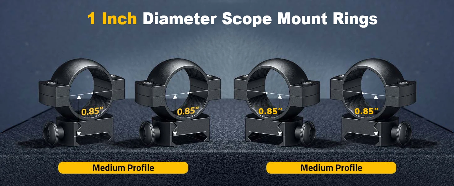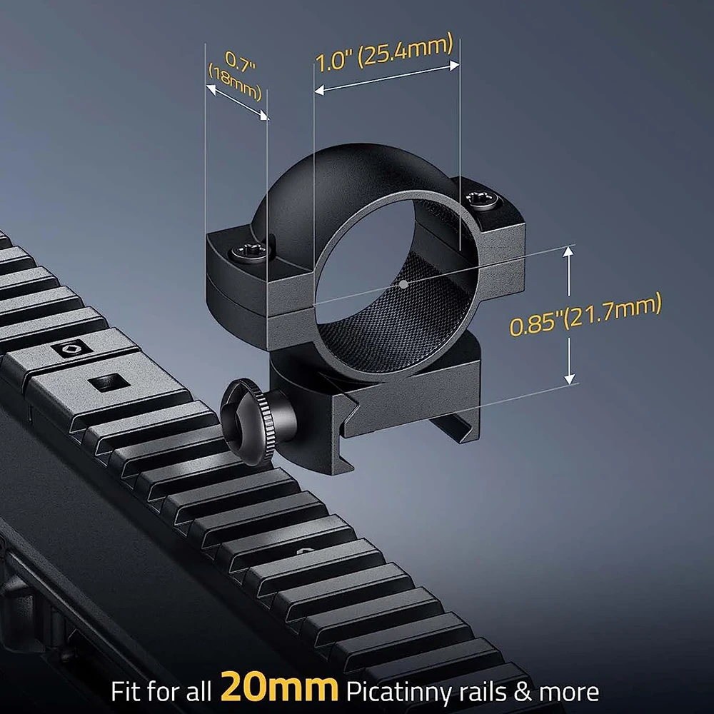 1. Anillos medianos de alcance Picatinny: los anillos de alcance de 1 pulgada colocan el centro del tubo de alcance a una altura de 1,2 pulgadas desde la base. Perfecto para todos los rieles Picatinny de 21mm y más.